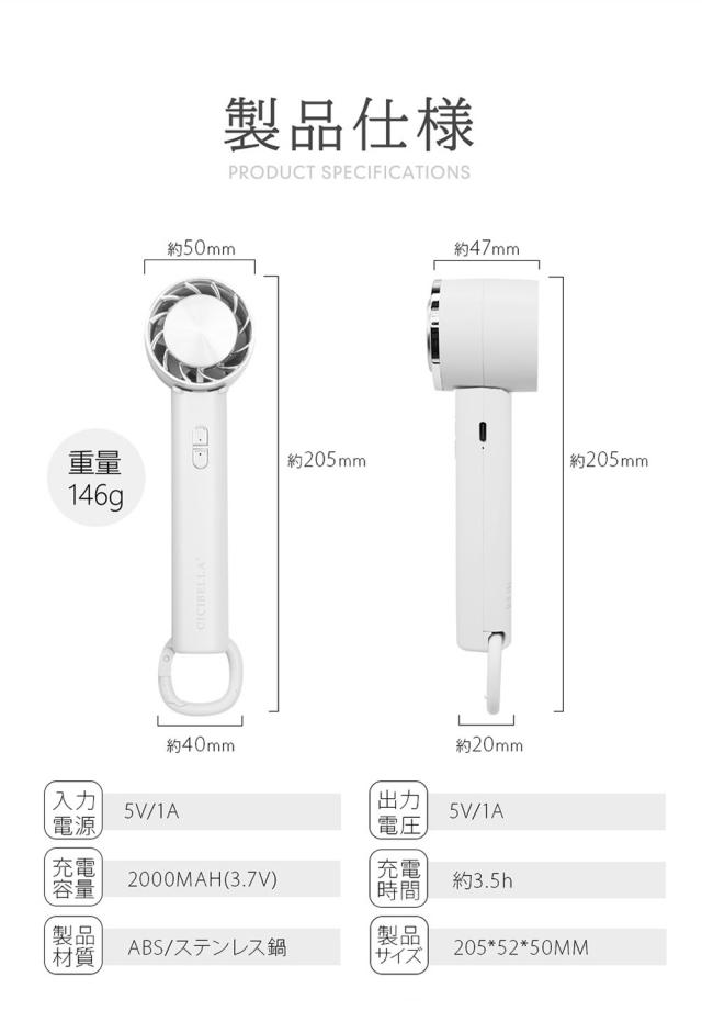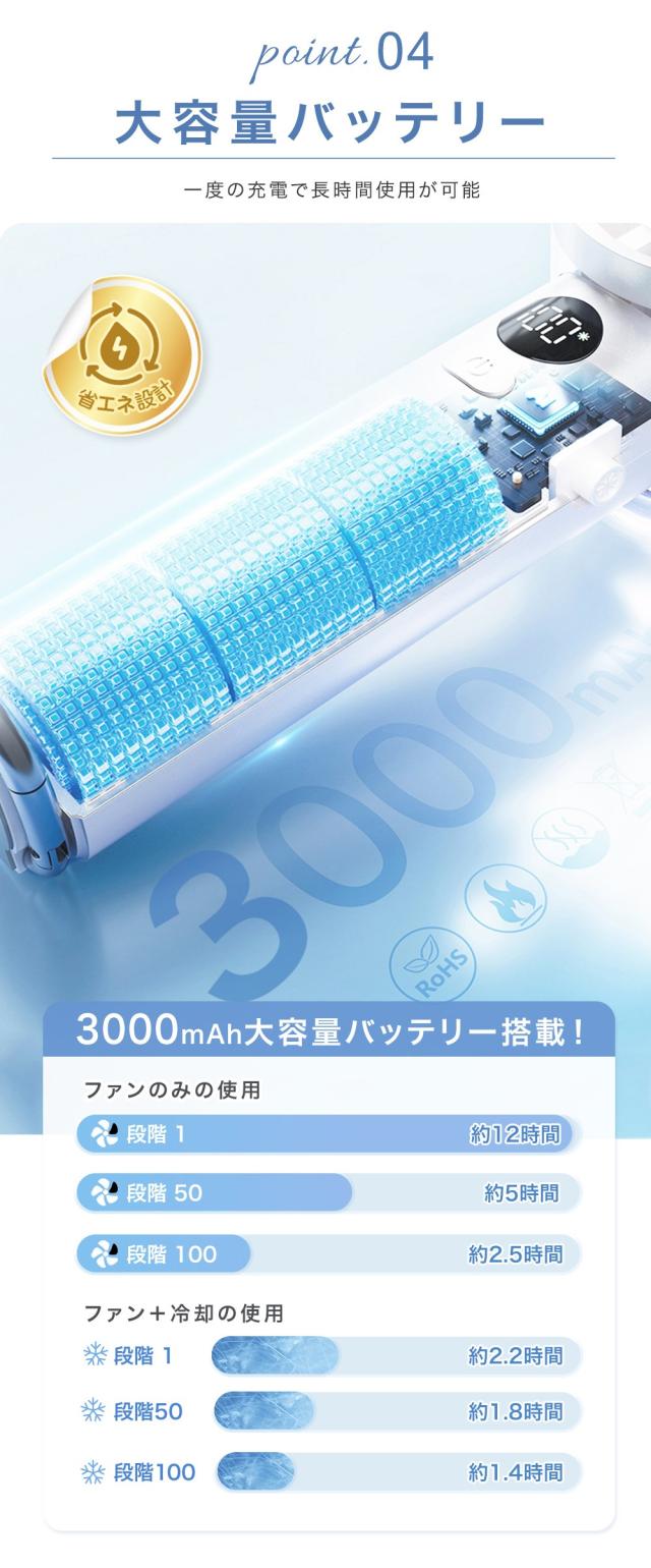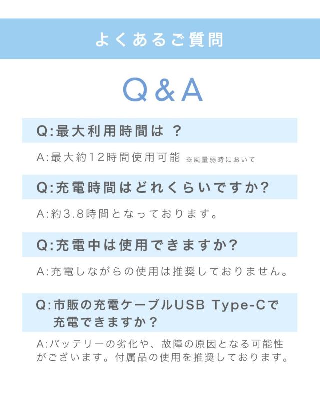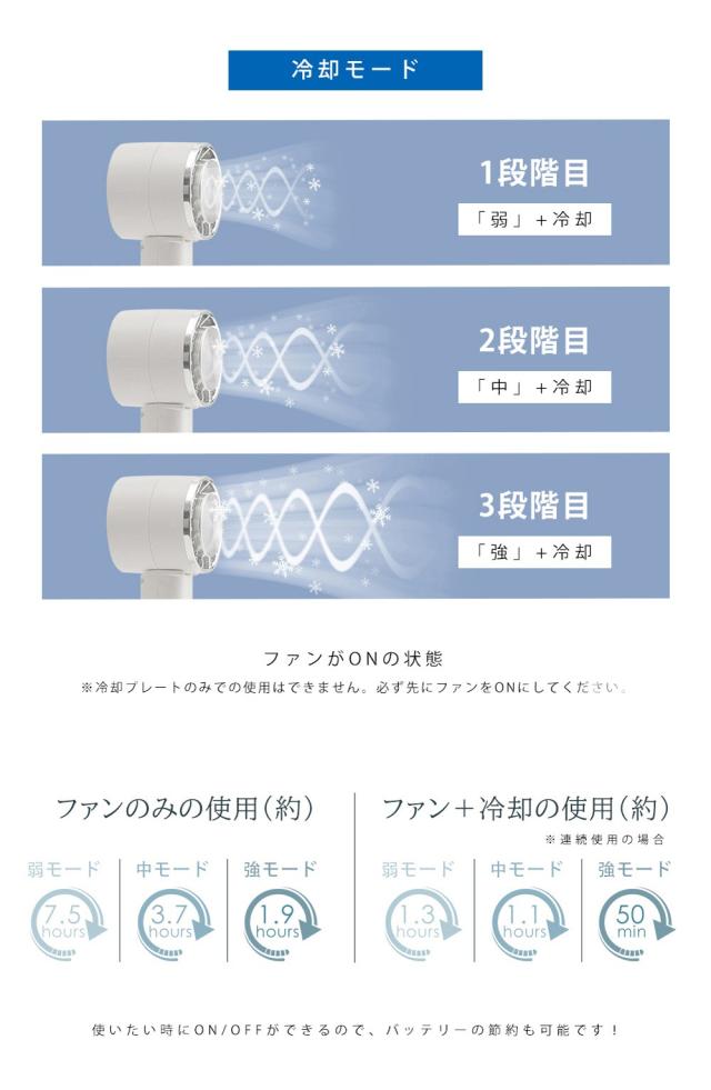 ファンのみ使用 弱:約12時間 中:約5時間 強:約2.5時間 ファン+冷却の使用 弱:約2.2時間 中:約1.8時間 強:約1.4時間