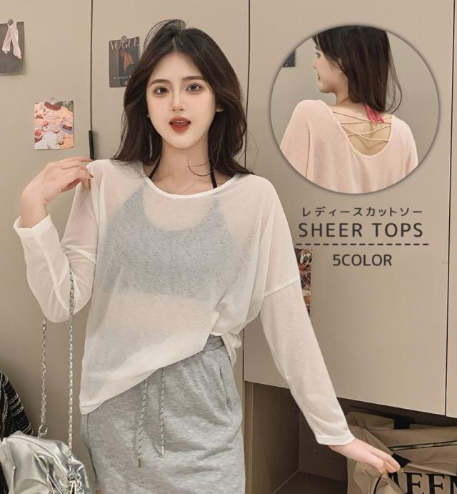 カットソー シアートップス 長袖 レディース 女性 婦人 トップス 薄手 透け感 クルーネック 丸首 レイヤード 重ね着 バック