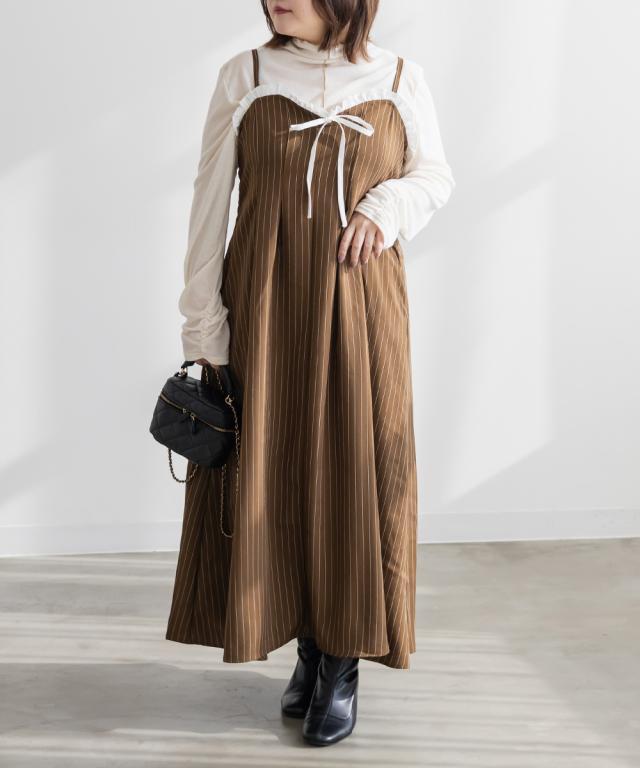 | 3Lを着て、見頃なども丁度良くすっきり綺麗に着用出来ました。後ろはゴムなので、フィット感がありながら窮屈感はなかったです!ウエスト部分にタックがたっぷり入っていてお腹周りもすっきりカバーしてくれます!すらっとしたシルエットながら、しっかりボディラインをカバーしてくれるディティールでした。ストライプ×リボン×フリルのときめき要素が詰まったキャミワンピで、アジャスター付きで肩紐の長さを調整できるので、バスト位置もちょうどよく着られました。Tシャツやブラウスを合わせて甘めに、シンプルなトップスでカジュアルに、着回し力も抜群の一枚です◎ |