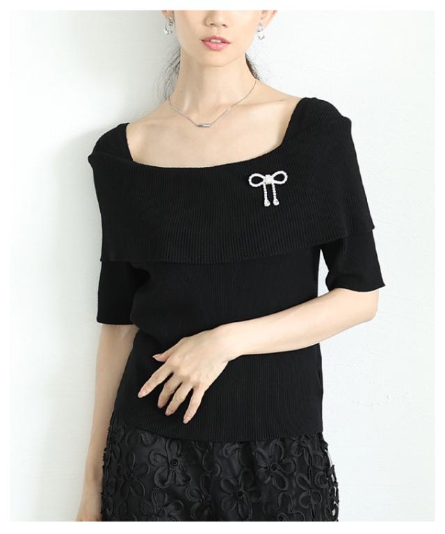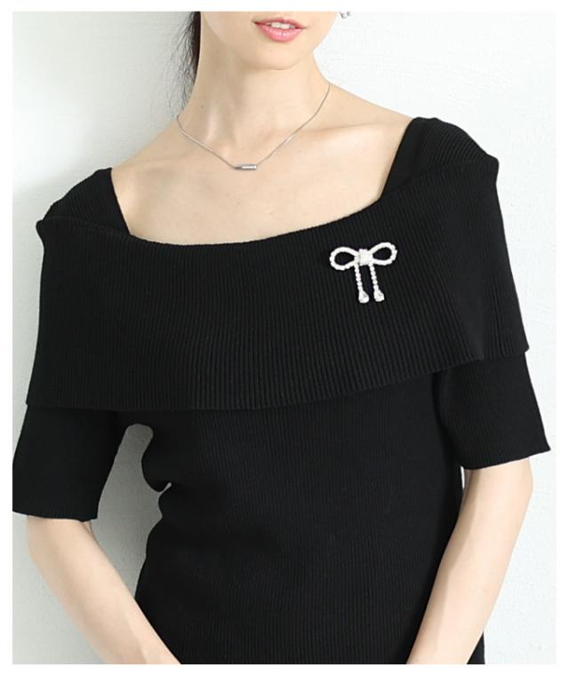 春新作 オフショルリブニット半袖トップス レディース ファッション トップス ニット オフショルダー リブ 半袖 5分袖 ビジュー リボン 無地 夏 夏服 30代 40代 50代 60代 サワアラモード sawaalamode otona 大人 cawaii 可愛い 洋服 かわいい服 almam-68884
