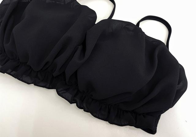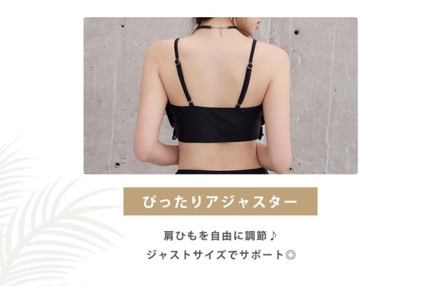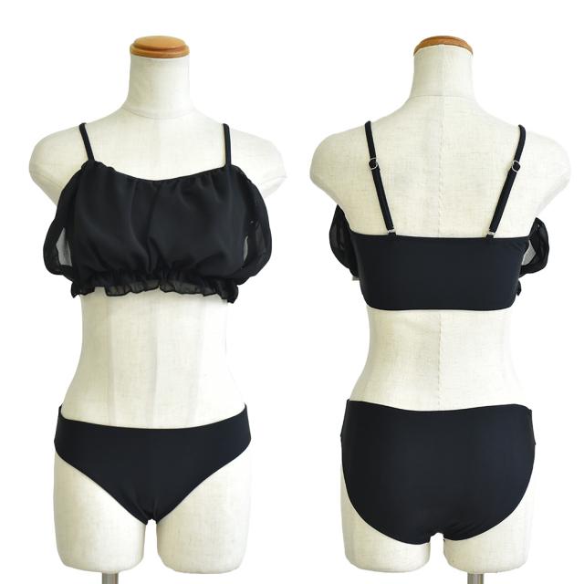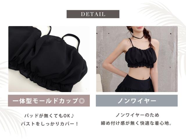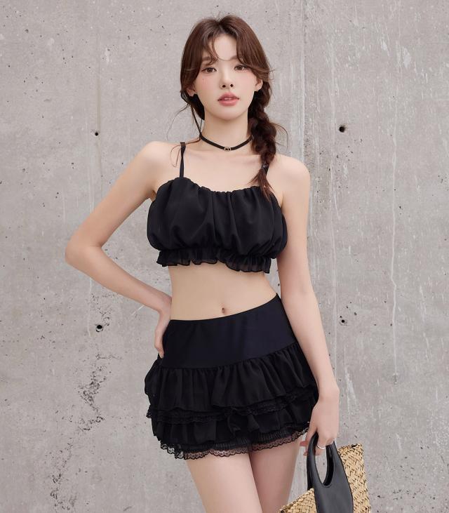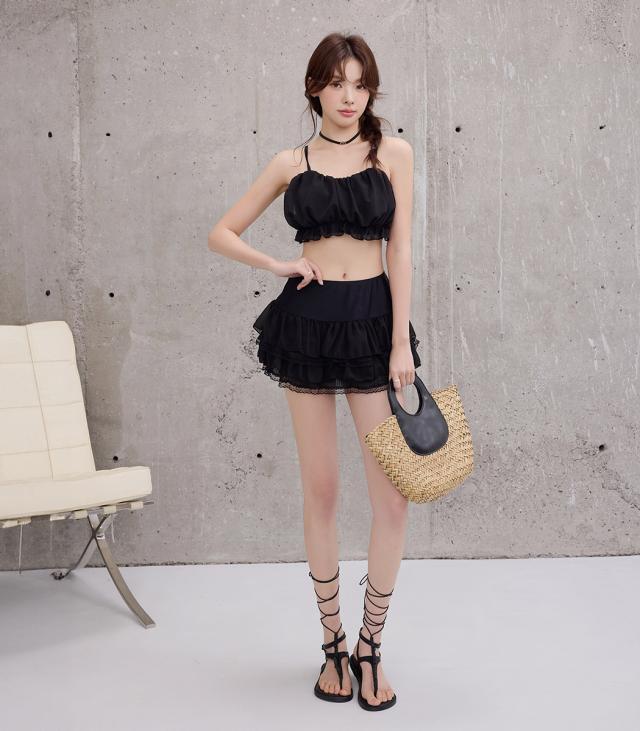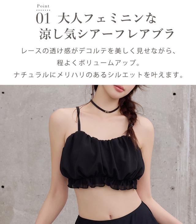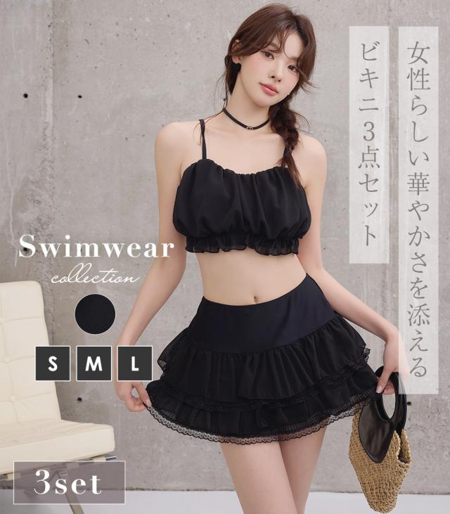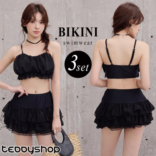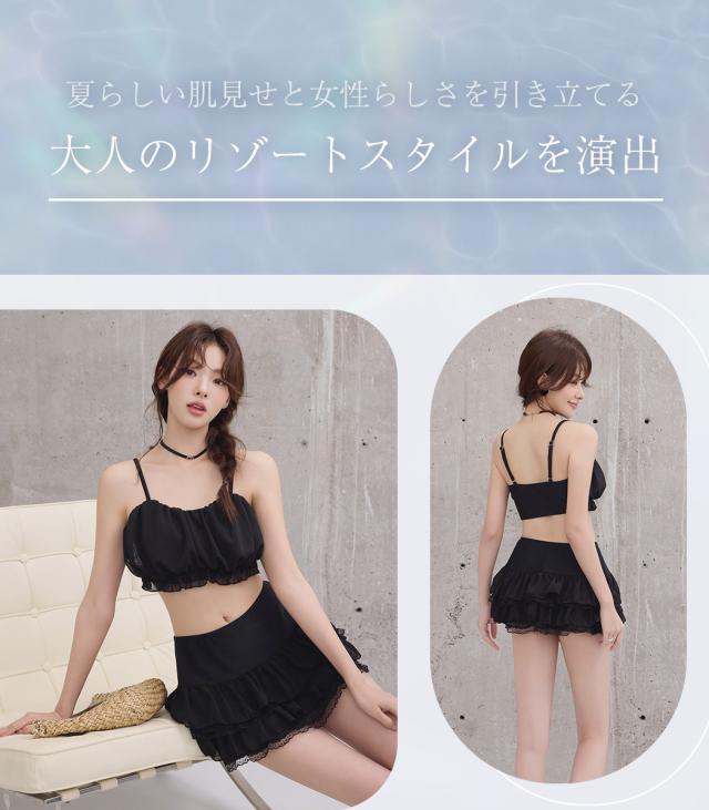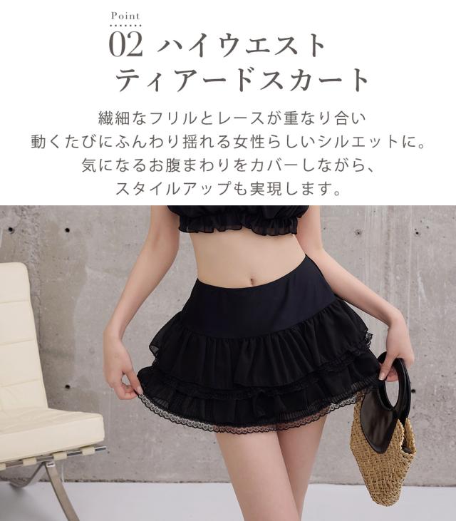 夏新作 ビキニ シアー 水着 レディース ティアード スカート 3点セット フレア セパレート ハイウエスト 肩ひも調節 アジャスター フリル レース ノンワイヤー ウエスト お腹 ヒップ 太もも カバーアップ スタイルアップ 無地 モノトーン 黒