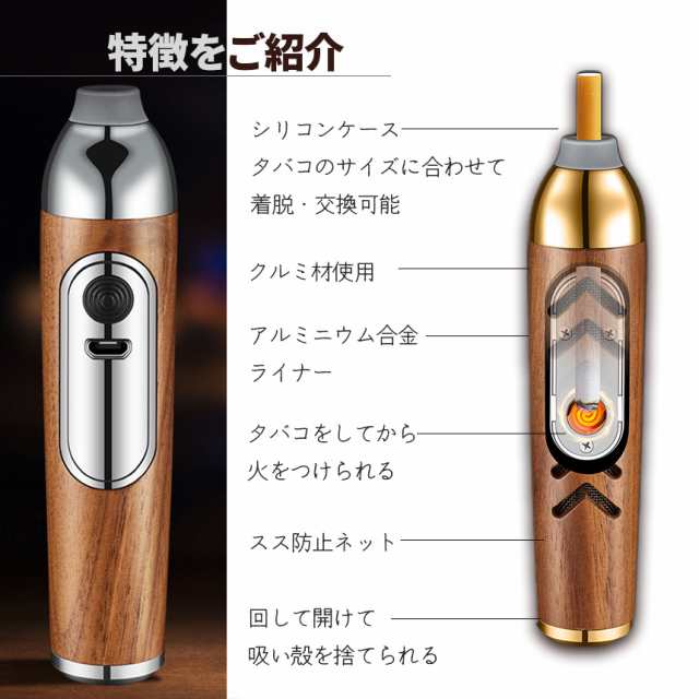本体にゆっくりタバコを差し込んでください。先端を内部の着火部分に合わせ、ボタンを長押しすると火をつけることができます。(火をつけてから差し込むことも可能です。)吸い終わりましたら、そのまま本体のケース内に押し込んでください。数本ほど吸い殻は収納可能ですが、吸い方によっても変わりますので、早めにお捨てになることをお勧めします。底面のふたが開きますので、そこからお捨て下さい。