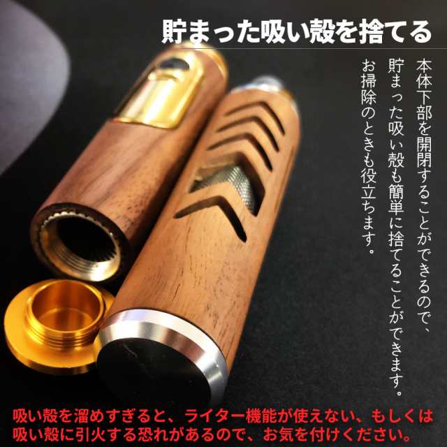 紙巻きたばこは灰が落ちたり、散らかったりと何かと灰問題は尽きませんが、このタバコにはめて使用するタイプの携帯灰皿は灰を落とすことなく煙草を吸えます。風の中やゲーム中、車でも灰を気にすることなくタバコが吸えます!そして、煙草をさしてボタンを長押しすれば火をつけられるライター機能付き!