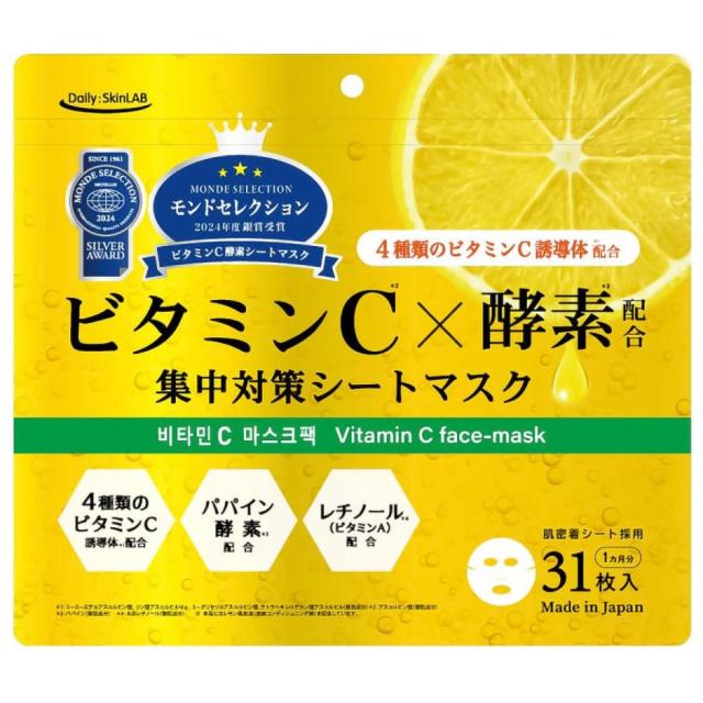 紫外線による乾燥などの肌悩みに!ビタミンC+4種類のビタミンC誘導体を配合の集中対策シートマスク。やわらか密着シート採用で使い心地が良くお肌のことを考えた贅沢仕様。31枚入りで1か月分。毎日のお手入れに使えるたっぷり大容量