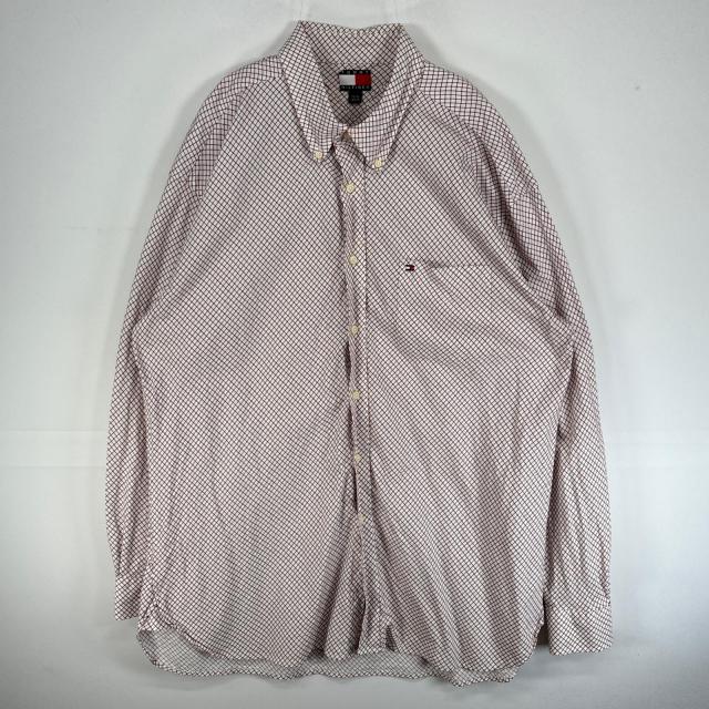 古着 90s/90年代 トミーヒルフィガー TOMMY HILFIGER 長袖シャツ 胸ポケ ボタンダウン ロゴ 刺繍 大きいサイズ XL レッド系 チェック
