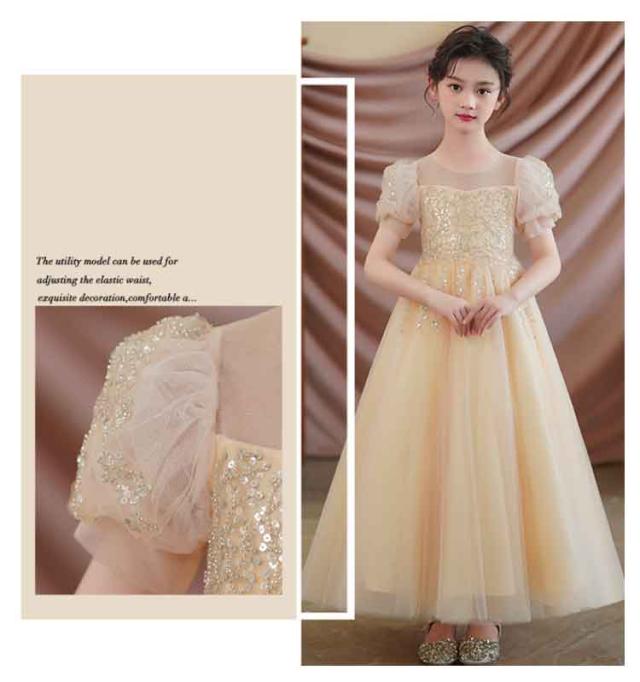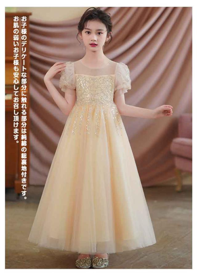 | パフスリーブロングドレス。 お子様のデリケートな部分に触れる部分は純綿の総裏地付きです。お肌の弱いお子様も安心してお召し頂けます。 キラキラ輝くスパンコール、舞台映えする豪華感に溢れるピアノの発表会用こどもドレスです。 首元シースルー素材でロングドレスなのに、軽やかな印象に。 舞台やピアノ発表会や結婚式や入学式やハロウィンやクリスマスなどのプレゼントにはおすすめです。 | |