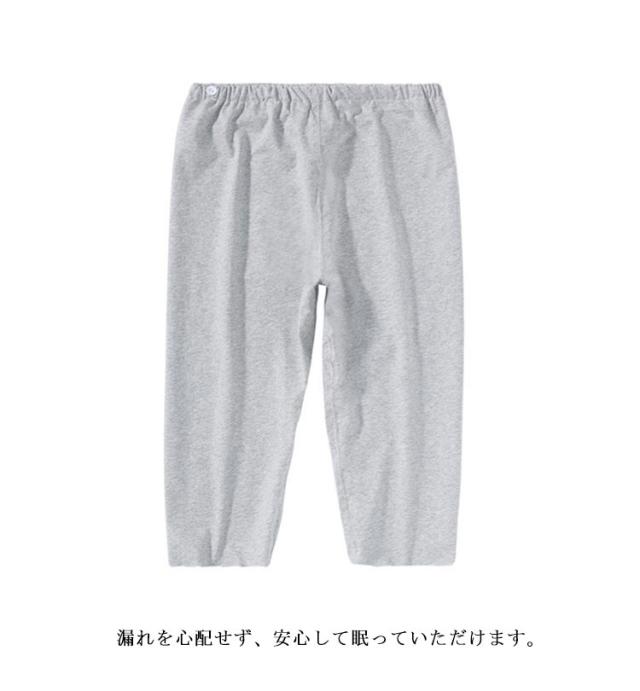 | 介護用おねしょズボン。【7分丈】【ネイビー、グレー】 腰回りは柔らかく伸びの良い総ゴム設計。 吸湿性と通気性を兼ね備えた肌に優しい柔らかな綿100%。 ズボンタイプなので動いたり寝返りしたりしてもカバー力があり、シーツを汚す心配が減ります。 漏れを心配せず、安心して眠っていただけます。 | |