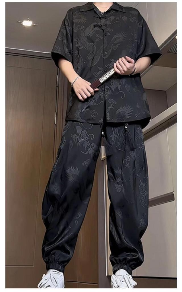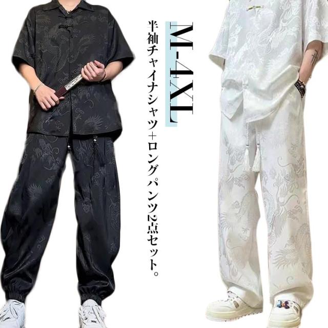 接触冷感 チャイナ服 上下 メンズ 半袖 龍柄 セットアップ チャイナシャツ カンフーシャツ カジュアルシャツ ロングパンツ 涼しい 上下セット チャイナボタン ルームウェア UVカット ダンス 2点セット 普段着 部屋着 太極拳 唐装 演舞服 男性用 父の日 春 夏 送料無料