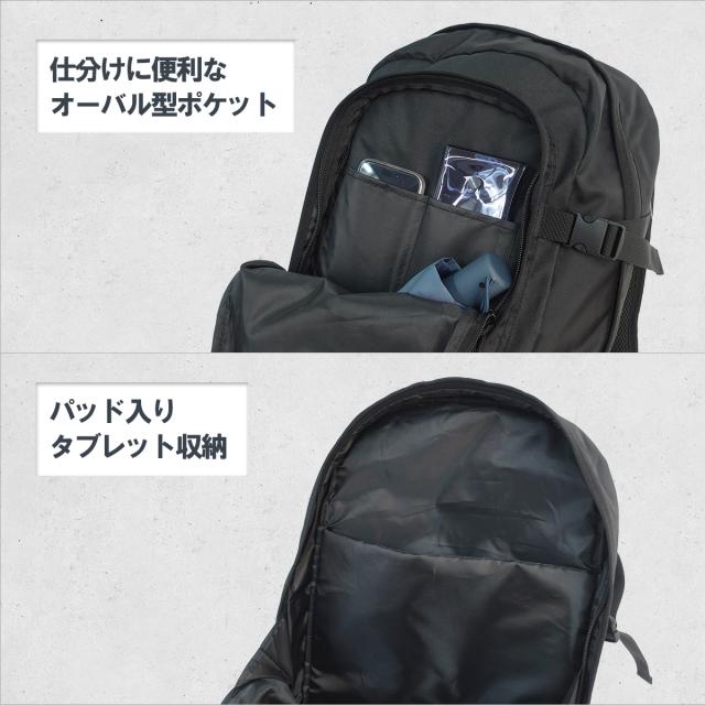 フロントには仕分けに便利なオーバル型ポケット、内装にはパット付きポケットを備えていて、タブレット収納にも対応しています。
