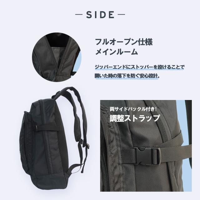 両サイドにはバックル付きの調整ストラップを装備し、荷物量に応じて出し入れがスムーズにできます。