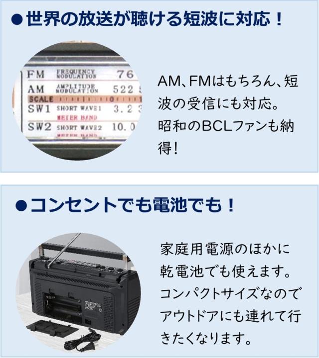 カセットテープの再生・録音はもちろん、FM/AMに加えて短波ラジオ(SW1/SW2)にも対応。