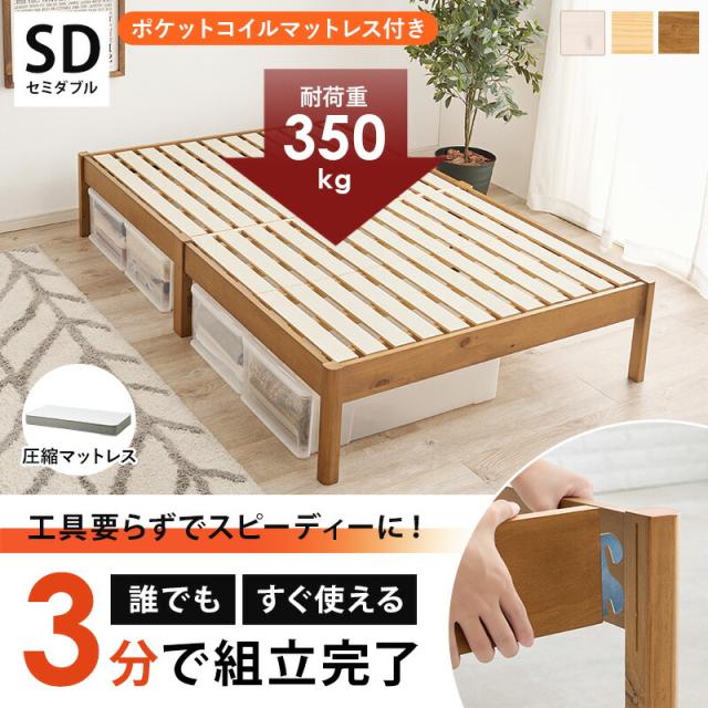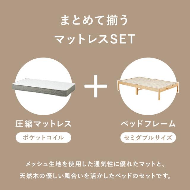 マットレス付セミダブルベッド ポケットコイル マットレスセット 天然木 木製 組立簡単 ネジなし 工具不要 すのこベッド 萩原 セミダブルサイズ 幅120 ベッド下収納 丈夫 通気性 頑丈 おしゃれ 北欧 一人暮らし MB-5145SD3302