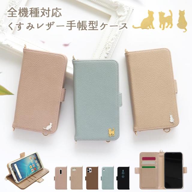 スマホケース 手帳型 全機種対応【くすみレザー手帳ケース×ネコパーツ】メール便送料無料 受注生産