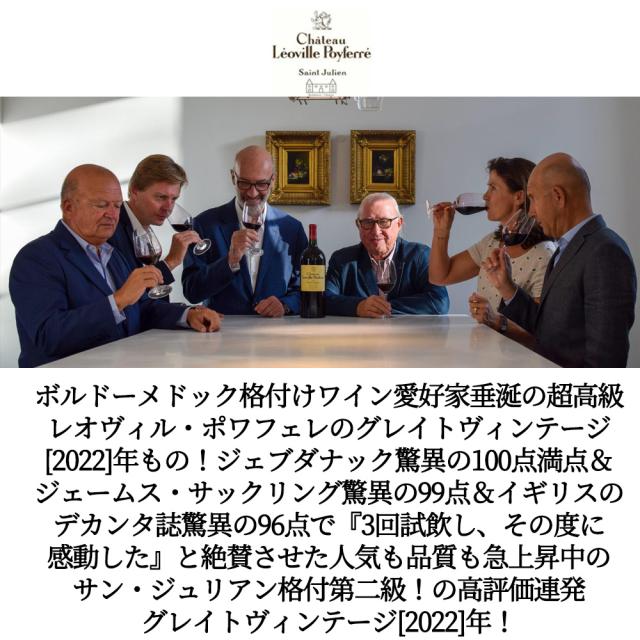 ボルドーメドック格付けワイン愛好家垂涎の超高級レオヴィル・ポワフェレのグレイトヴィンテージ[2022]年もの!ジェブダナック驚異の100点満点&ジェームス・サックリング驚異の99点&イギリスのデカンタ誌驚異の96点で『3回試飲し、その度に感動した』と絶賛させた人気も品質も急上昇中のサン・ジュリアン格付第二級!の高評価連発グレイトヴィンテージ[2022]年!