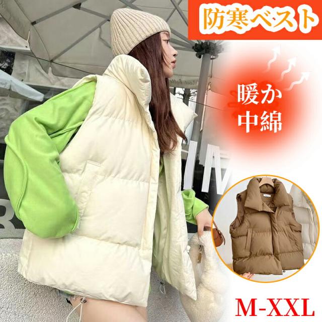 【送料無料】あったか 冬ベスト ストリート ゆったり 中綿入り 防寒対策 ベストジャケット ダウン風 ハイネック 通勤 普段着 ブラック ホワイト カーキ M L XL 2XL
