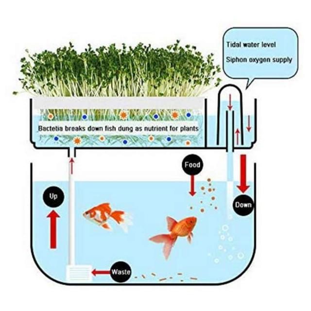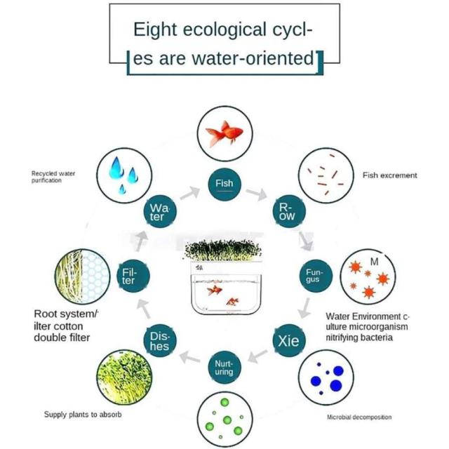 共生生態系:水族館の水槽は、魚、野菜、微生物の魔法の共生系です。微生物は魚の肥料を栄養素に分解し、上部の植物を成長させ、植物は魚が泳ぐ水をきれいにします。