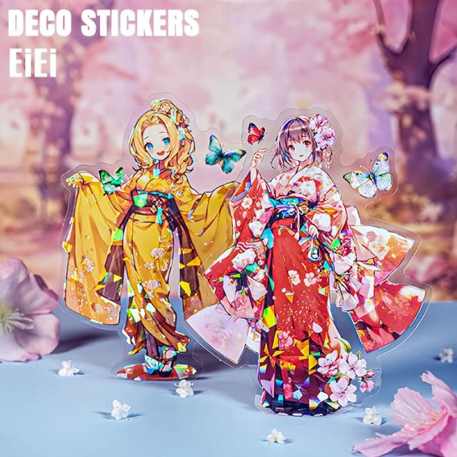 人物シール 大きめ 箔押し 貝シェル光 和風 女の子 女子 日本の女の子 着物 和風ガール 芸姑 少女 イラストシール コラージュ素材 PET 耐水 透明 シール かわいい 女の子シール クリアシール デコレーション コラージュ 素材 ハンドメイド ファイルシール 手帳 DIY