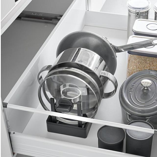 ●シリコーン製の滑り止めクッションが付いているので、フライパンなど収納時の取っ手位置のまま自立してくれます。