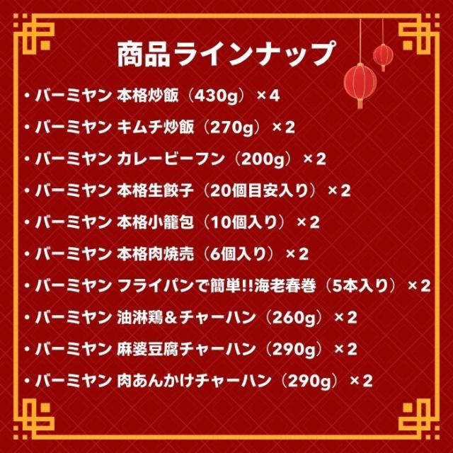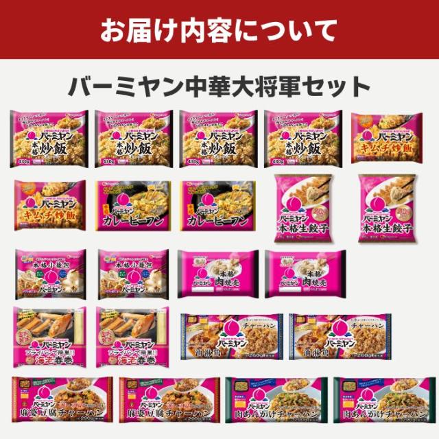 【50%OFFクーポン配布中!】 冷凍食品 中華総菜 / バーミヤン 中華大将軍セット(10種22袋)/ 炒飯 餃子 小籠包 焼売 キムチ炒飯 春巻 ビーフン 油淋鶏 麻婆豆腐 肉あんかけ チャーハン ギョーザ 送料無料 中華惣菜 ギフト プレゼント