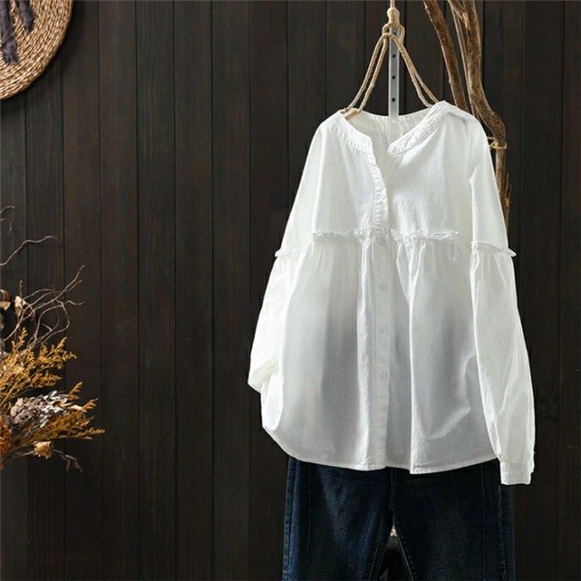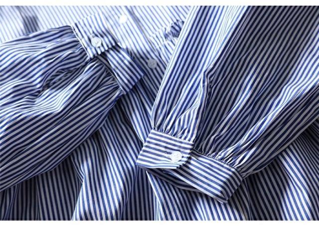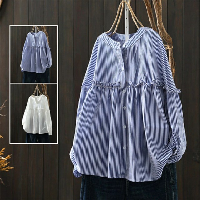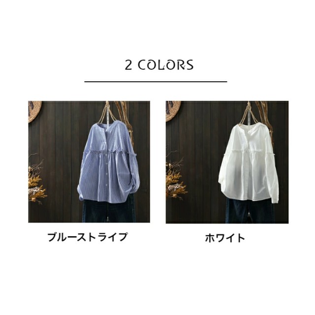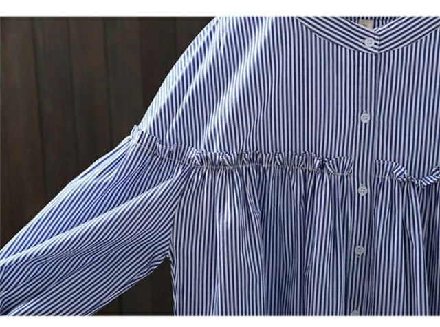 シャツ レディース シャツ ストライプ柄 長袖 森ガール 綿100 フェミニン 切り替え ショート丈 ラウンドネック シャツ