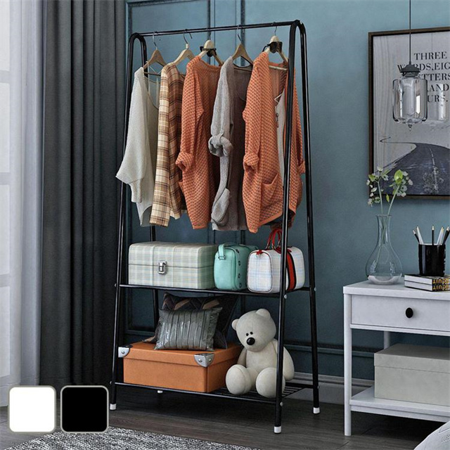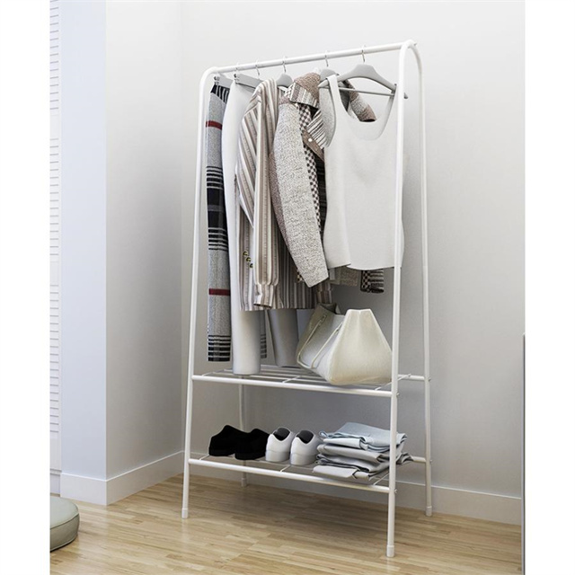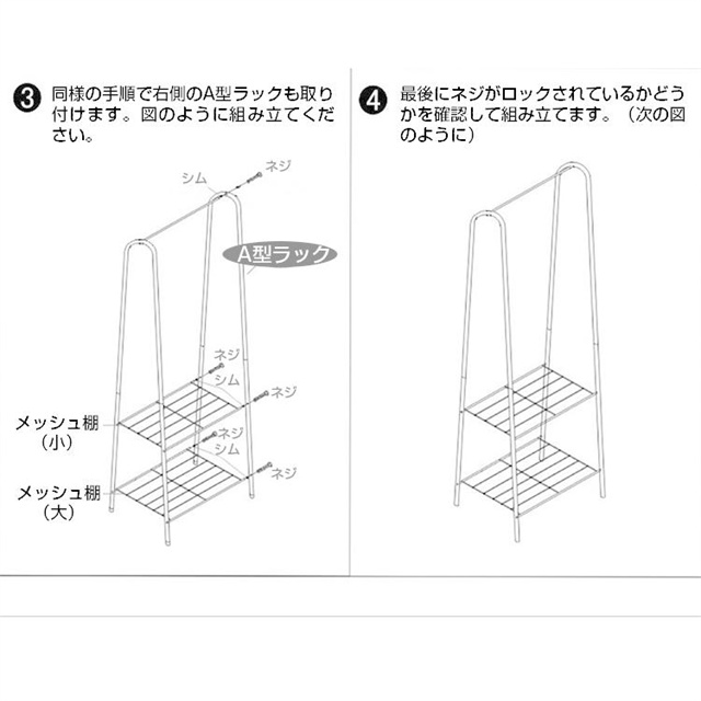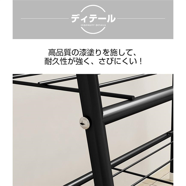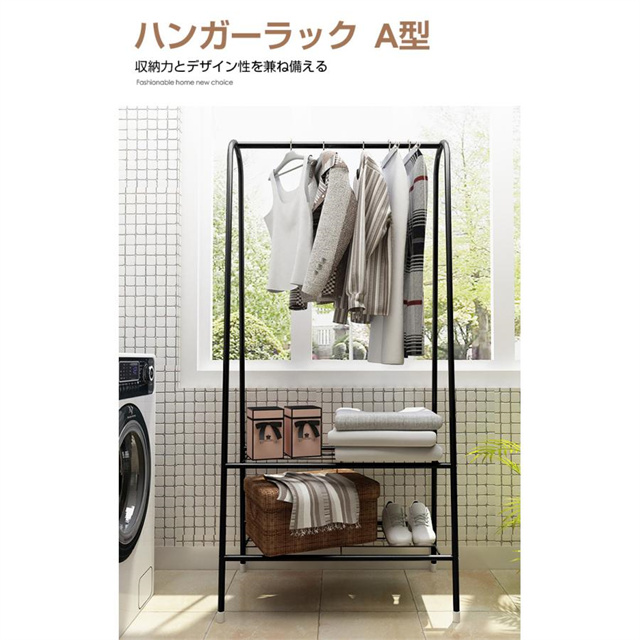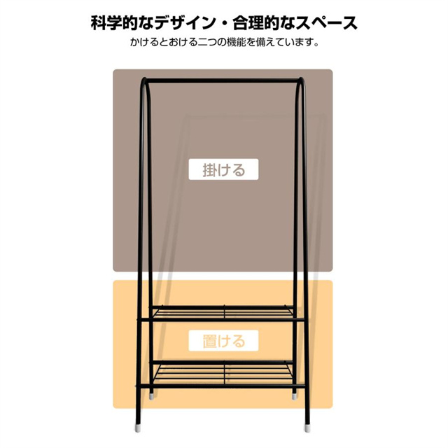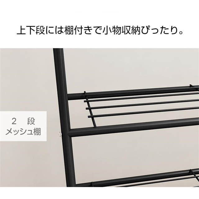 上にコートや洋服などを掛けることができます。また下に2段メッシュ棚をつけており、靴、カバン、帽子やファッション小物も収納できます。