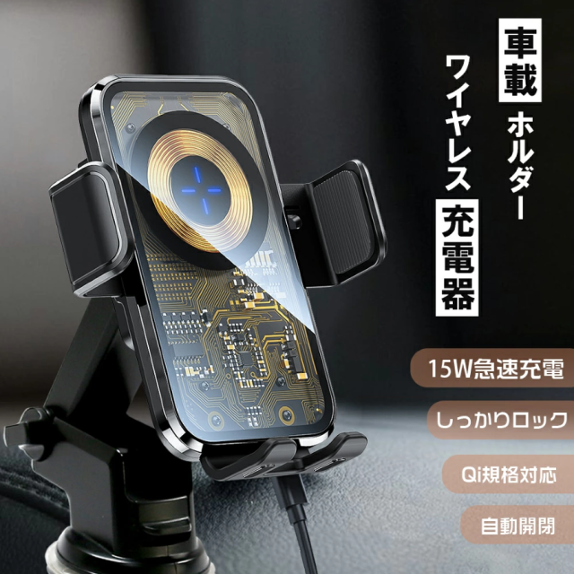 【自動開閉】スマホホルダー 車 Qi 対応 車載ホルダー ワイヤレス充電 吸盤タイプ 最大15W出力 スマートセンサー スマホスタンド 車載用 充電 充電器 急速充電 TypeC USB ケーブル 各種 スマホ iPhone Android
