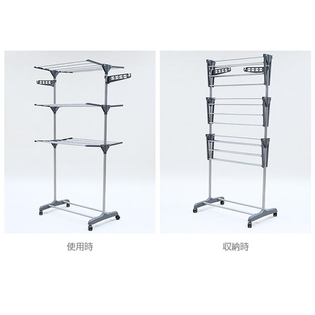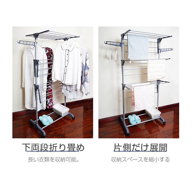 物干し棚が折りたたむことで、片側だけを使用することも可能。室内と室外に乾燥しても良いし、室内に服などを収納するためにも使用できます。使用しない時はコンパクトに折りたたんで収納できます。 ●安定性&高耐荷重