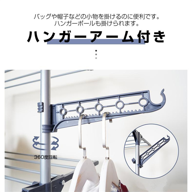 360度回転できるキャスター付きで、服などを掛けたまま屋内や屋外で動かすのが楽々、お掃除も便利になります。