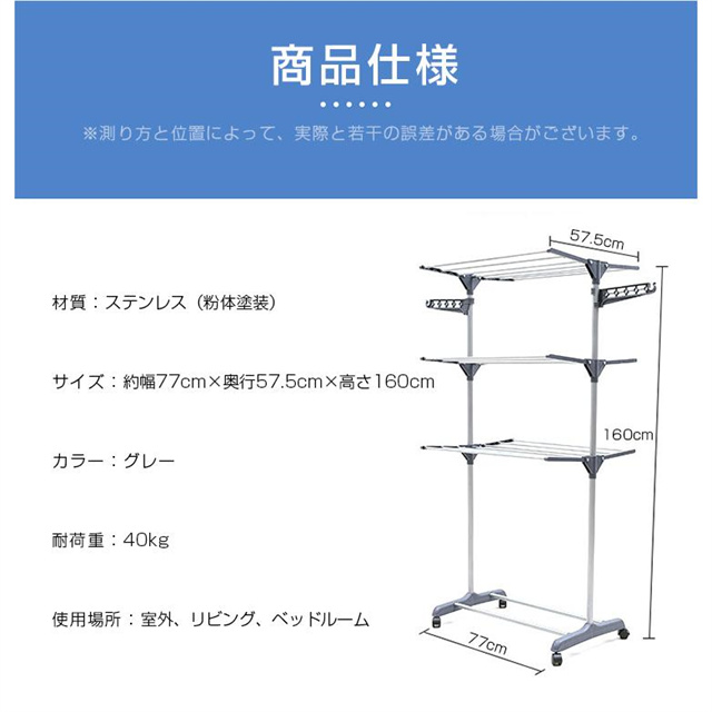 丈夫な作りで、抜群の強度を確保します。全然重さを気にせず重いコート、洋服、水気を含んだ重たい洗濯物など掛けても変形しにくく、安定感も抜群です。
