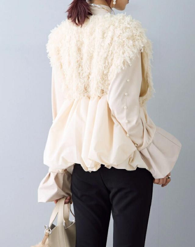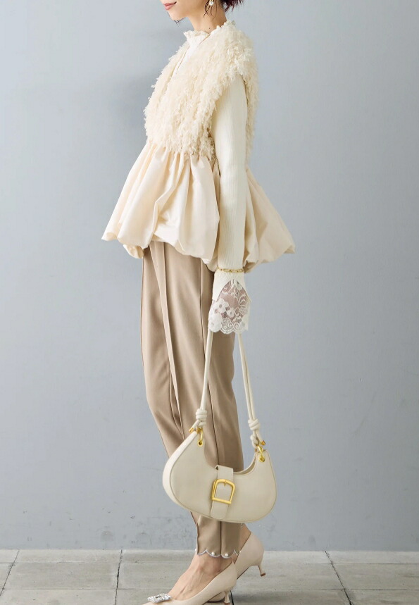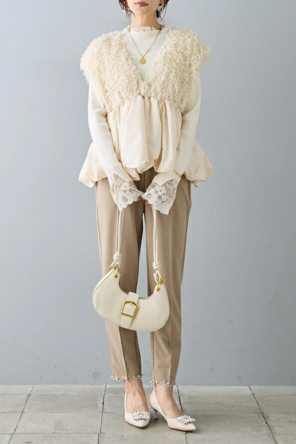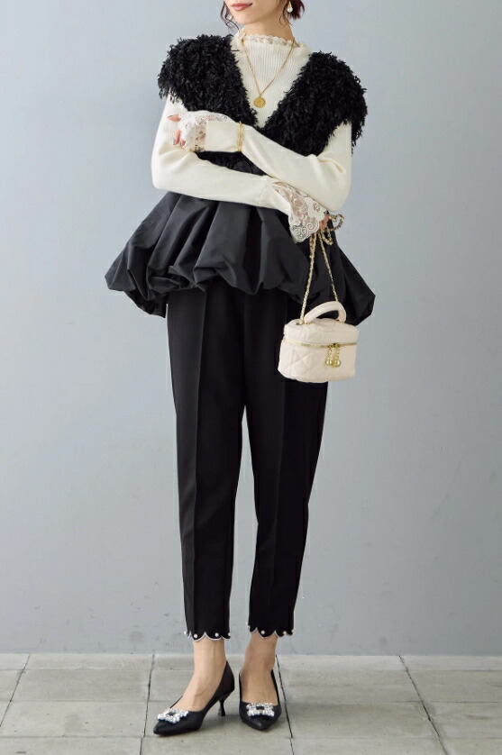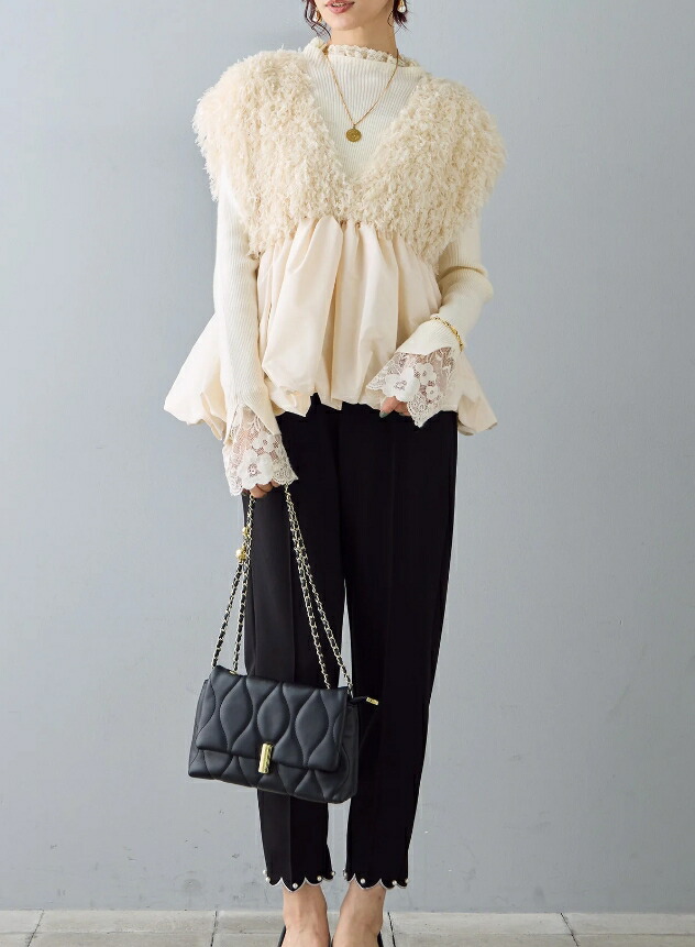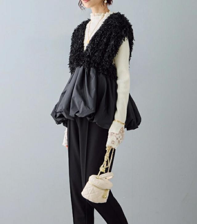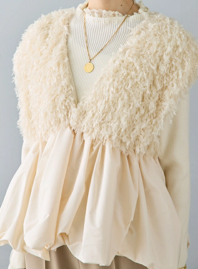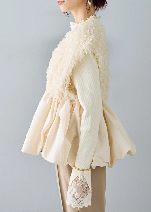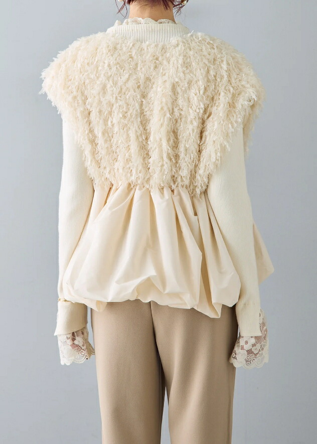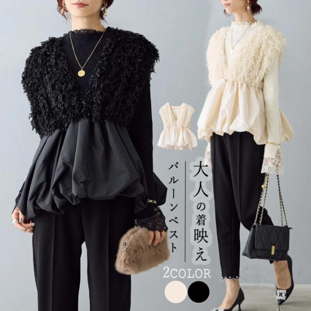 バルーンジレ レース ペプラム ふわふわ ベスト 深Vネック 裾フレア ジレ レディース ノースリーブ 袖なし ノースリ 重ね着 コーデ おしゃれ お洒落 大きサイズ 可愛い 春 秋