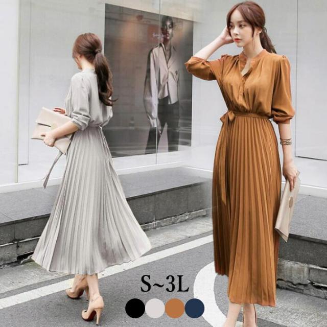 プリーツワンピース プリーツ フリルワンピース ワンピース ロウエストベルト付き フレンチスリーブ ワンピ ロング マキシ丈 Aライン 長袖 小さいサイズ 大きいサイズ エレガント 春 夏 S M L 2L 3L