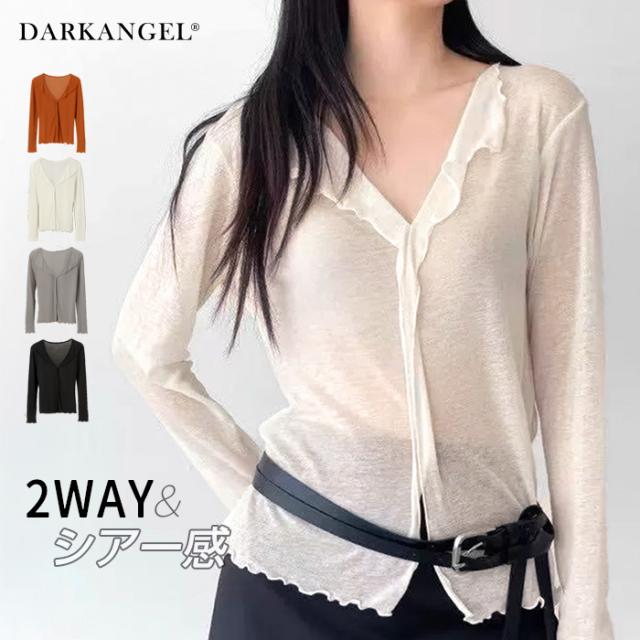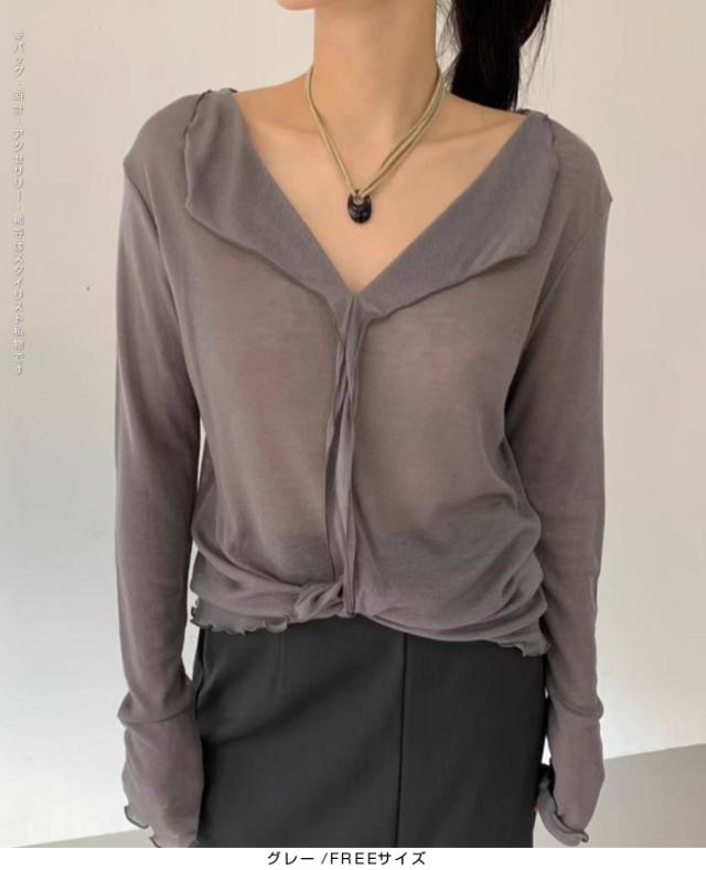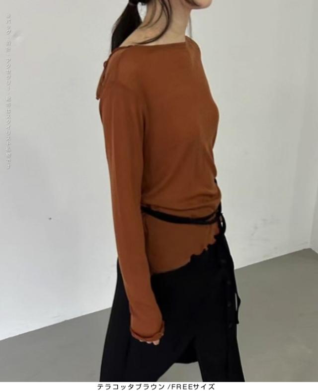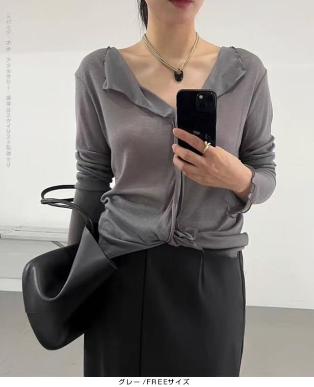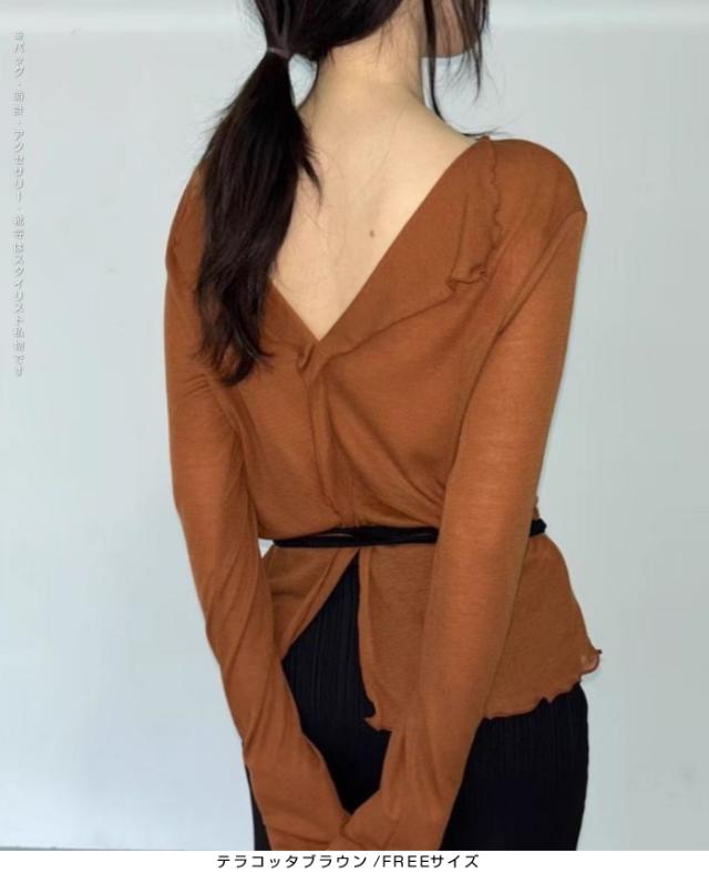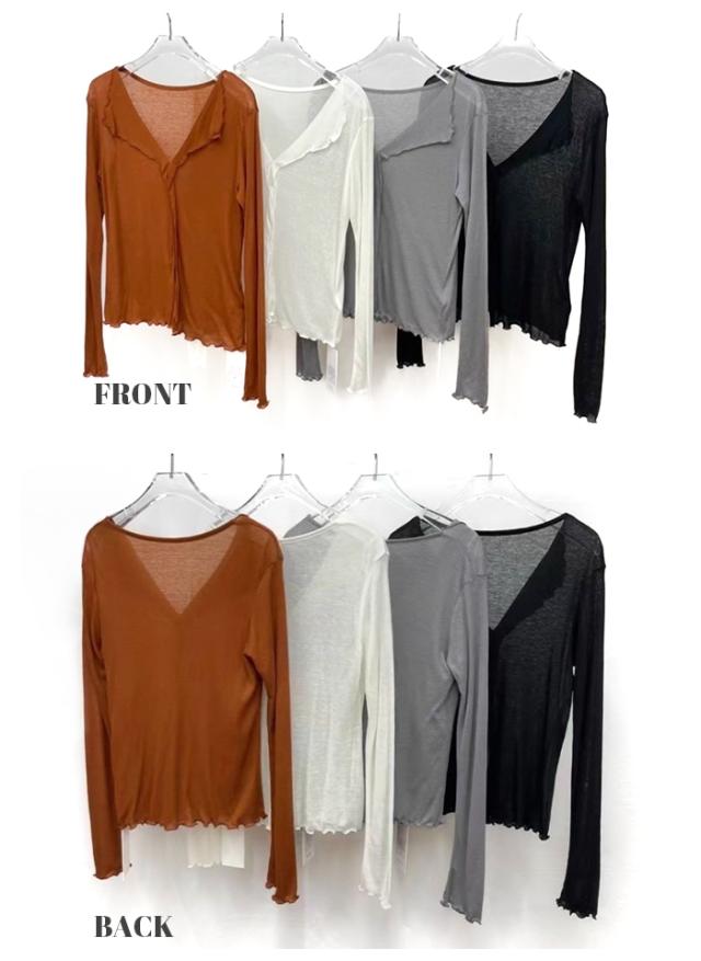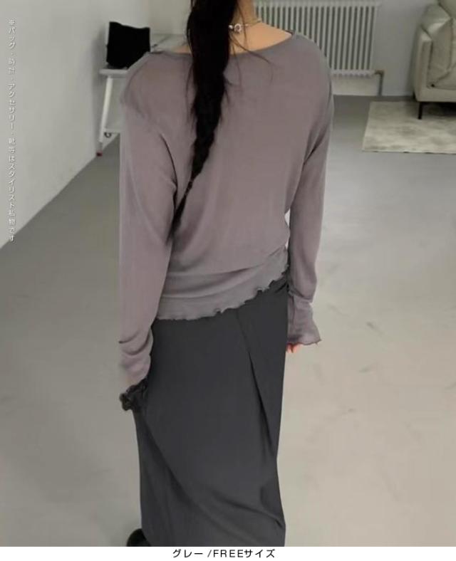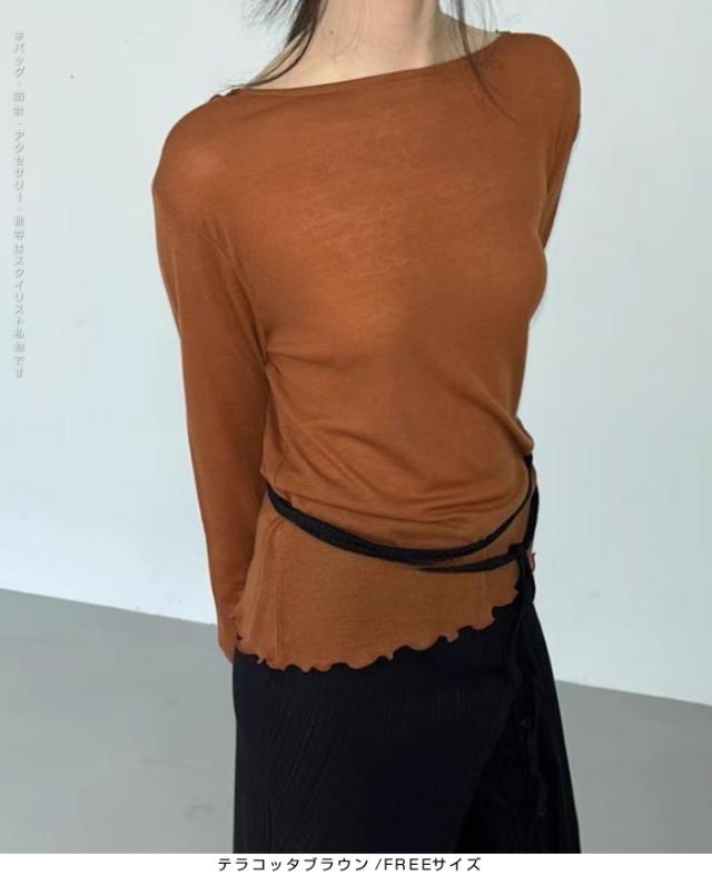 【前後2WAY&シアー感のある長袖トップス】 前後どちらでも着用できる2WAY仕様の長袖トップス。 軽やかで肌触りの良い透け感素材を使用し、 レイヤードや抜け感コーデにぴったり。 メロウ仕上げの縁取りと程よくフィットするシルエットが、 フェミニンかつこなれ感を演出。 シーズンを問わず着回せる、 1枚あると便利なアイテムです。 |