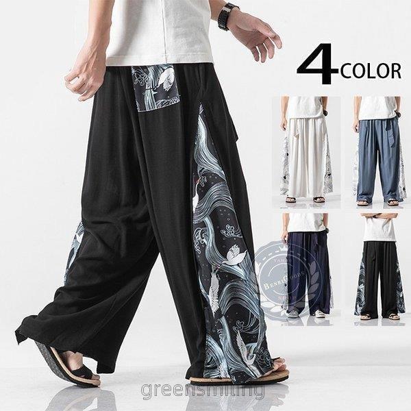 ワイドパンツ メンズ 麻ズボン 鶴柄 リネンパンツ ボトムス 涼しいパンツ サルエルパンツ イージーパンツ ゆったり