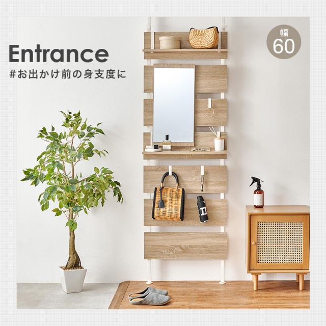 お部屋のいろいろな場所に設置できるミラー付き突っ張り式ラック。玄関での身だしなみのチェックや寝室のドレッサー替わりに。