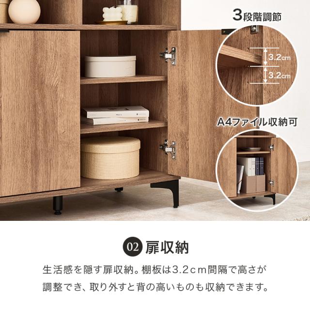 キャビネット 幅120cm リビング収納 背面コード穴付き 扉収納&オープン収納 収納家具 木目調 脚つき ホワイトウォッシュ