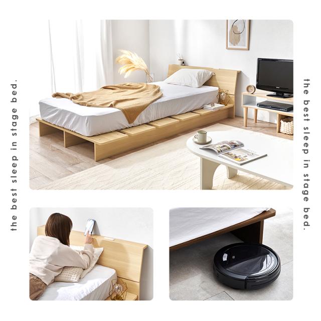 お部屋が広く見えるロースタイルのステージベッド 幅広設計でマットレス横に木目が見えるスペースができ、おしゃれな雰囲気を演出 ●ステージベッドは通常のベッドより幅広い設計。余裕のあるおしゃれな雰囲気 ●マットレス横にできるスペースはサイドテーブルのように物が置けます ●ロースタイルなので、お部屋に圧迫感がありません ●強度にこだわり耐荷重350Kgを実現 ●床板の角を丸く加工。万が一引っ掛けてもケガがしにくい ●すのこのような作りになっているので、隙間から湿気を逃がせる ●フレーム下は高さ16cmなので、お掃除ロボットが通れます 生産地:ベッド:ベトナム製 サイズ:ベッド:(約)幅120×奥行215.5×高さ60.5×床面高18cm 素材:主材:ベッド:[主材]プリント紙化粧パーティクルボード 内寸及び補足説明:■組立式 ■2口コンセント付 ※お客様組立て品につきましては、組み立て後に不良の連絡をされても対応ができません。組み立て前にパーツに不良・傷等がないか、必ずご確認下さいますようよろしくお願い申し上げます。 ※記載は商品仕様の一部です。仕様説明不足等の理由での返品はできません。特に適合等は必ずご確認ください。