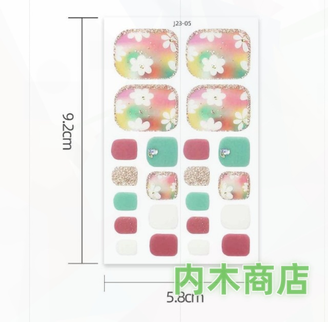 | サイズについての説明 | 8シート入り(176枚セット) 【ご使用前に】 ●爪に油分や水分、汚れが付着しているとシールが剥がれやすくなりますので、爪の表面をキレイに拭き取ってください。 ●甘皮を処理し、付属のファイルなどで爪の形や表面を整えるとよりキレイに仕上がります。 ●シートからネイルシールを剥がす際にはシートの外側部分を持って剥がしてください。 (1)製品を爪に合わせ、爪よりも少し小さめのネイルシールをお選びください。 (2)キューティクルラインと1mmほどの余裕があるところにネイルシールを貼ってください。 (3)ネイルシールを貼って余りのシールは爪の形に合わせて折ってください。 ファイルを利用して、爪の下の方向に向けて余りのネイルシールを削ってください。 (4)お好みの硬化方法を選んでください。 ・寝る前に貼り硬化する場合 ・自然光で硬化する場合:約2時間(自然光が多い室内と室外にて) ・UV&LEDライトで硬化する場合:約30秒 【剥がし方】 ●ウッドスティックでキューティクルラインからゆっくり押出しながら剥がしてください。 ※剥がしにくい場合はお手持ちのハンドクリーム等を塗ると効果的です。 ・UV&LEDライトで硬化すると自然光で硬化するよりも剥がしづらい可能性があります。 |