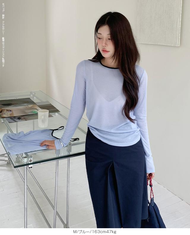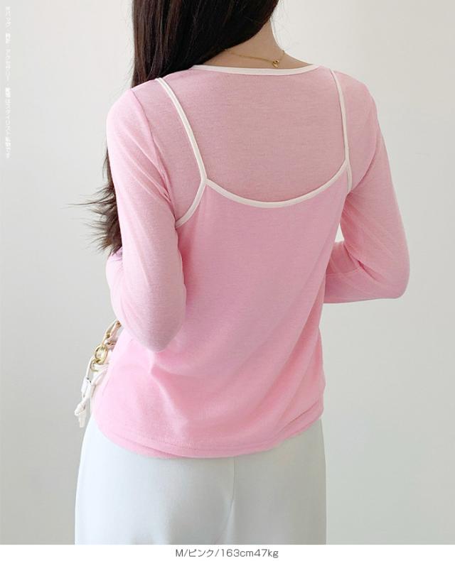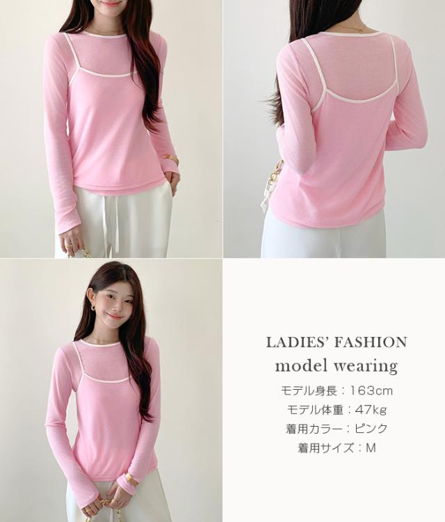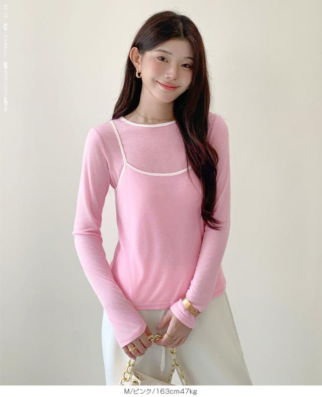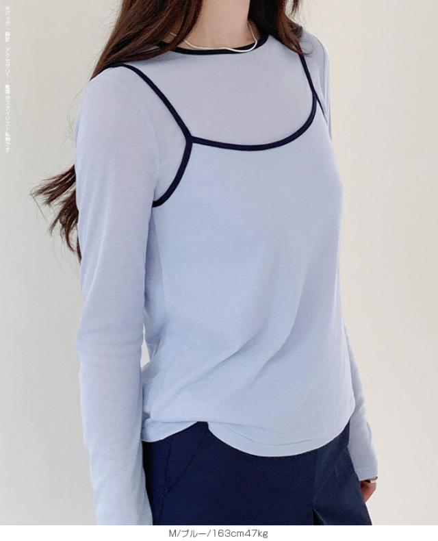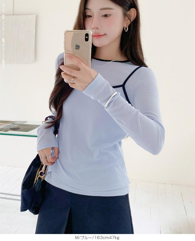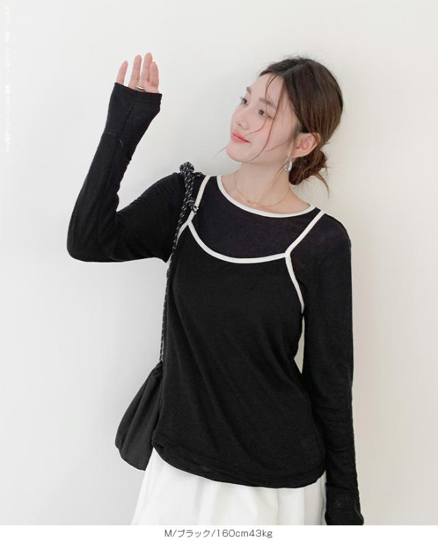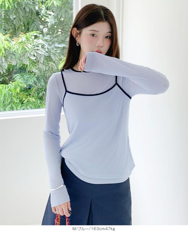 MAX1,500円OFFクーポン!カラー シアートップス セット レディース 長袖 Tシャツ キャミソール付き 透け感 レイヤード トップス 2点セット 春夏 秋 韓国風【バイカラーシアートップスSet】ダークエンジェル 送料無料 春新作 ●即納●