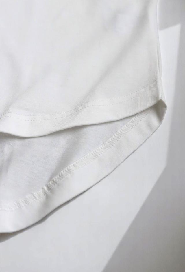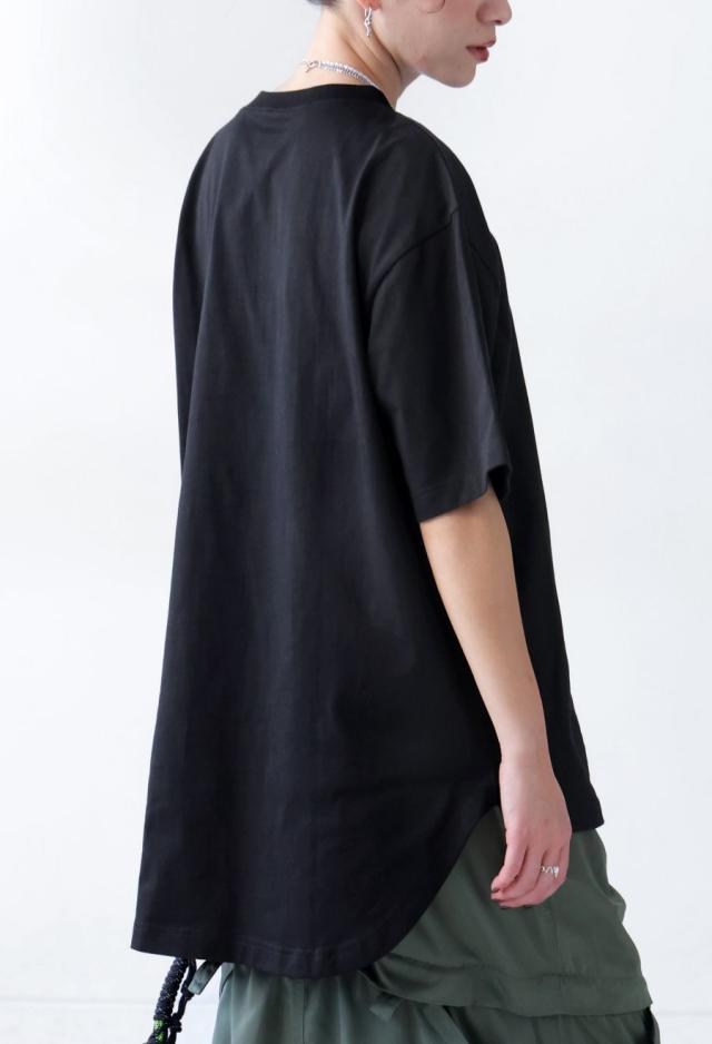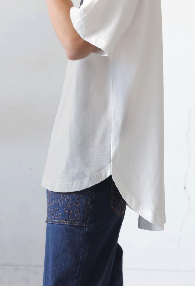 袖丈はやや長めの五分袖(半袖)、丈感はヒップラインを包むラウンド裾でこなれたシルエット。