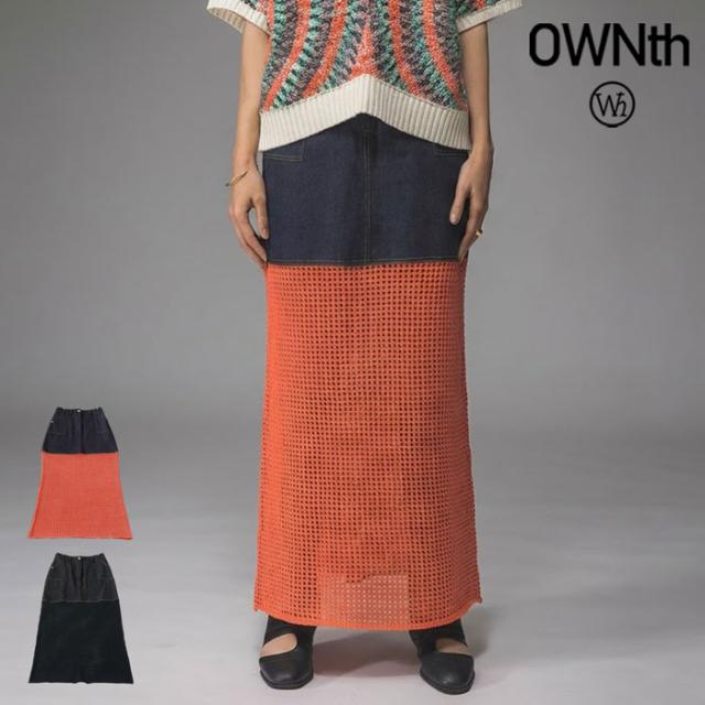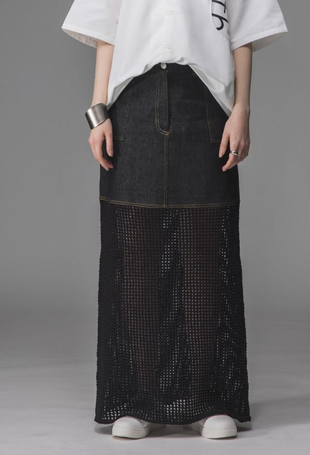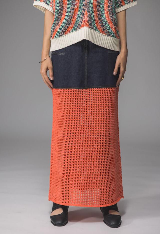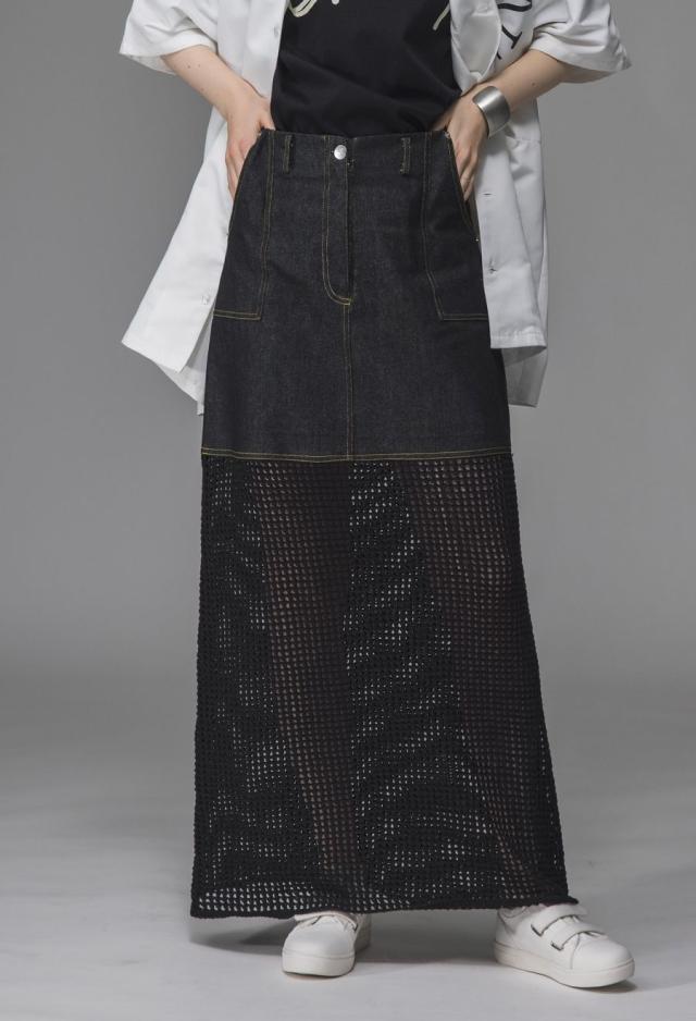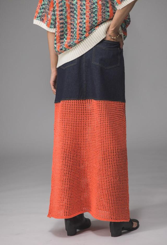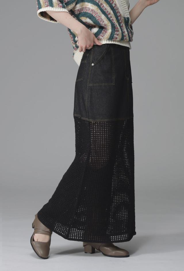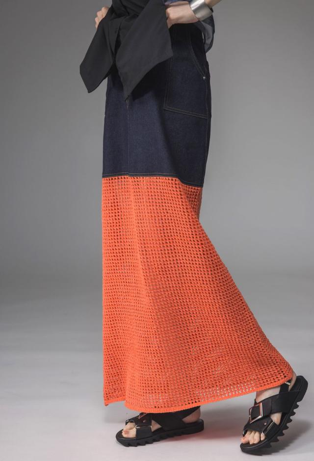 owt-0016 デニムスカート ニットスカート ドッキング メッシュ リボンヤーン 透け感 異素材 切替 体型カバー ロング ウエストゴム 綿100 綿 コットン 柔らかい おしゃれ Aライン