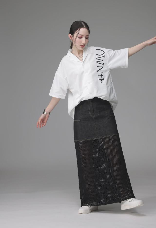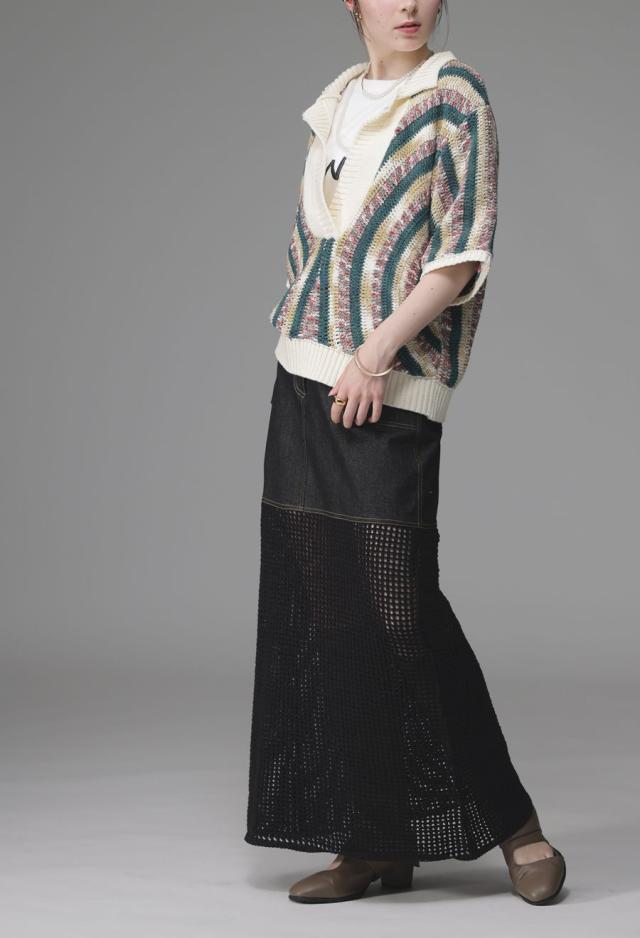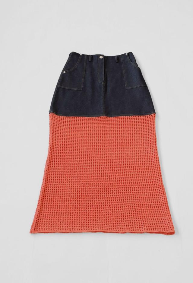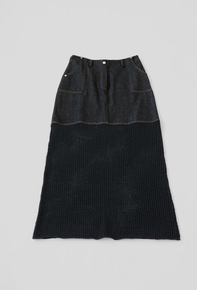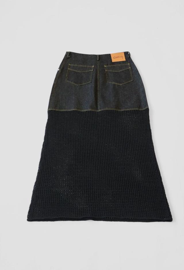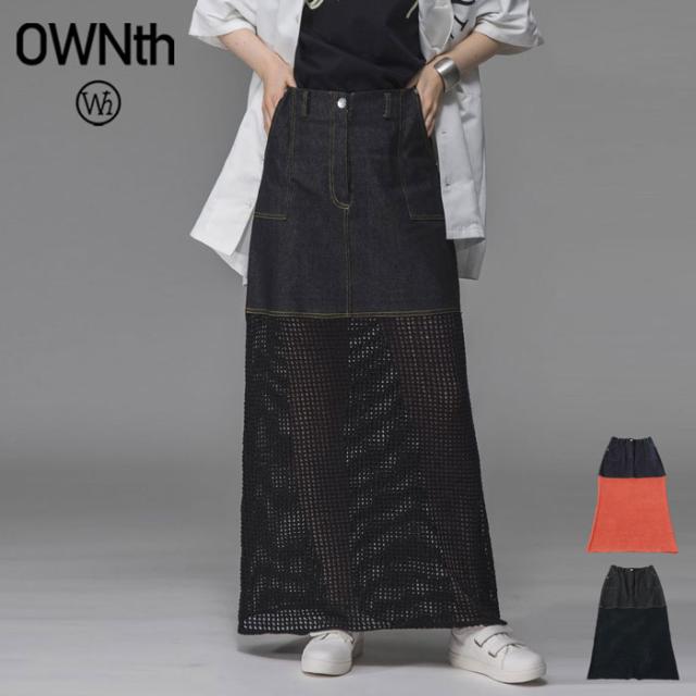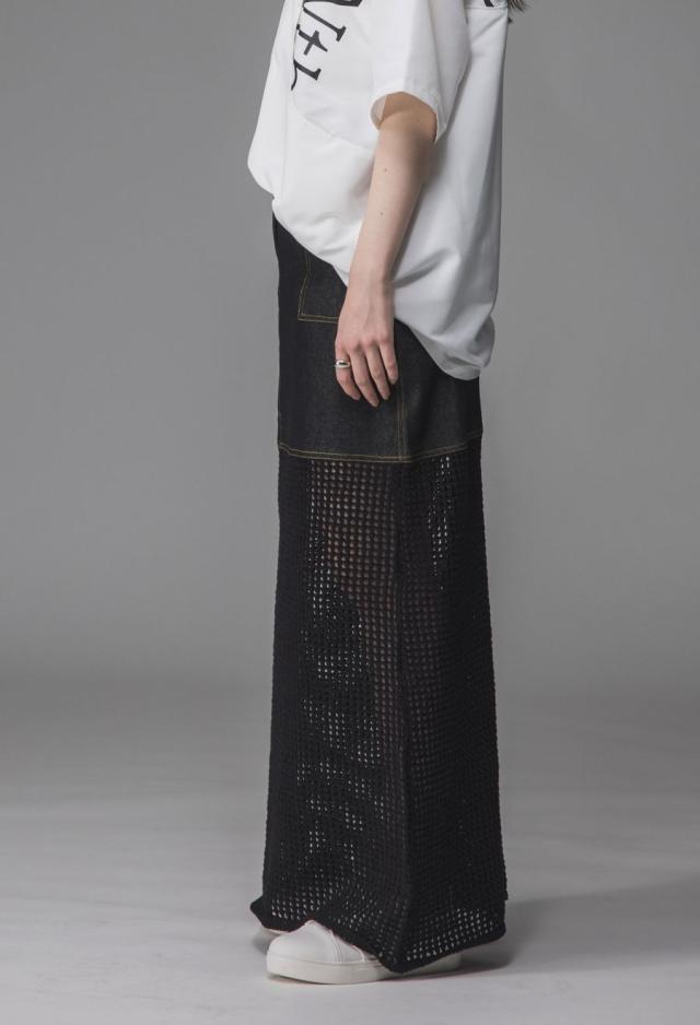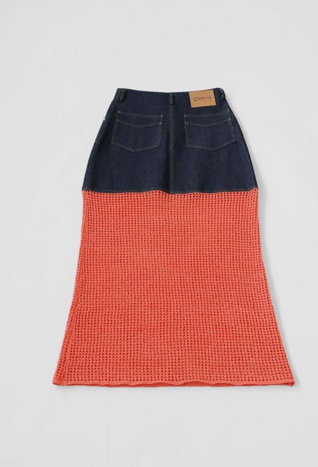 owt-0016 デニムスカート ニットスカート ドッキング メッシュ リボンヤーン 透け感 異素材 切替 体型カバー ロング ウエストゴム 綿100 綿 コットン 柔らかい おしゃれ Aライン