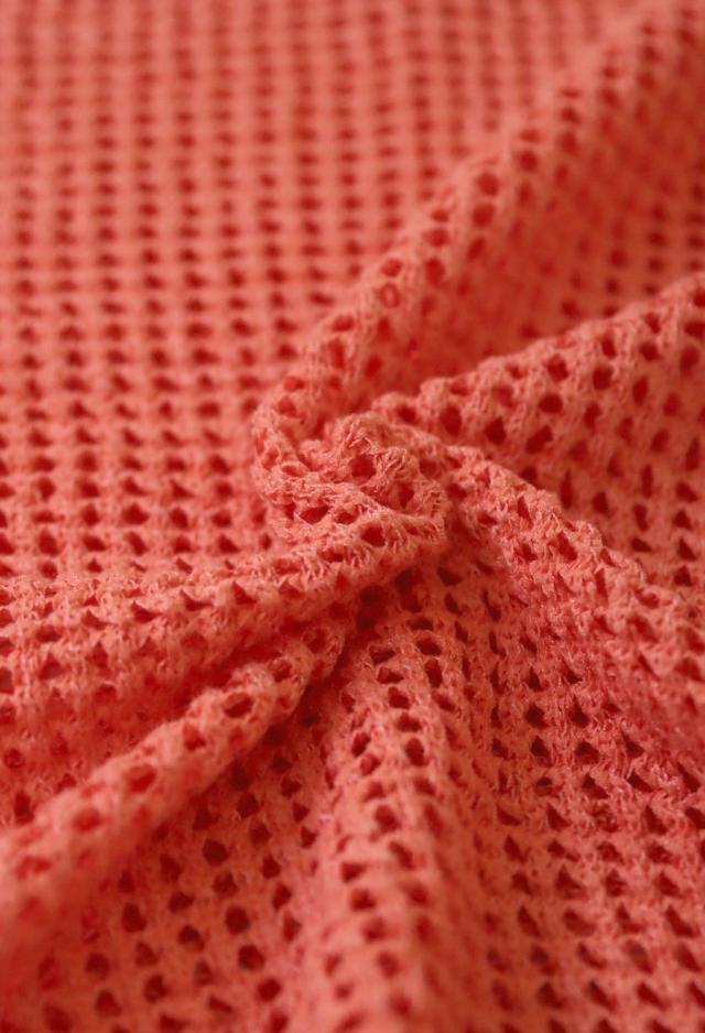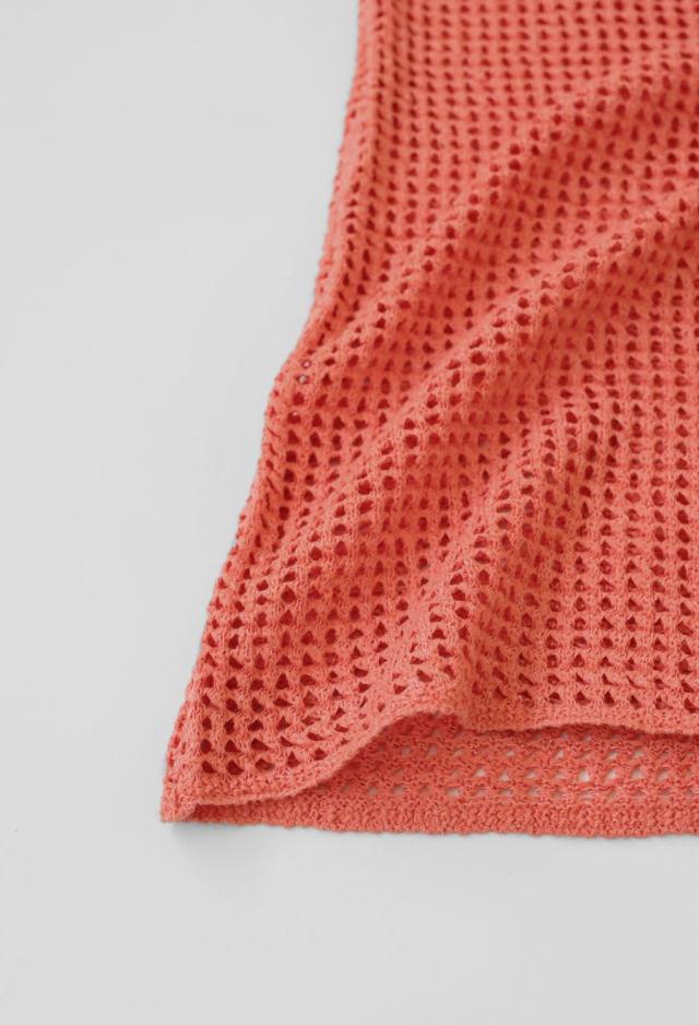 柄はメッシュ調の編地で、肌を透かすようなリボンヤーンが大人の抜け感を演出。