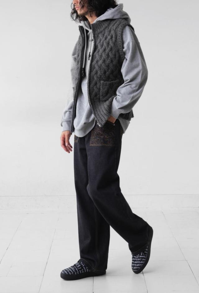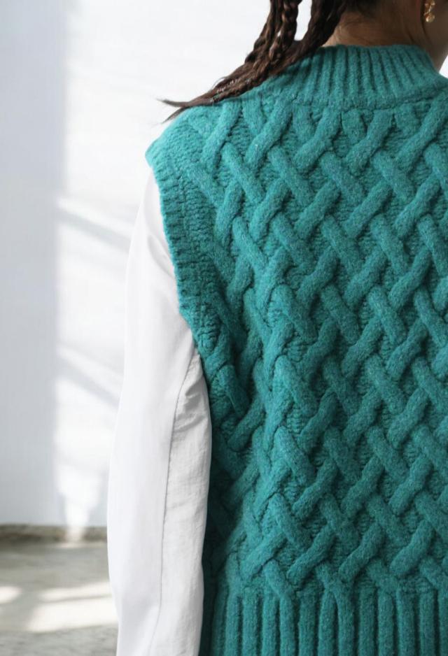 立体的な籠編み風デザインが印象的な、レイヤードコーデに映えるユニセックス仕様のニットベストです。