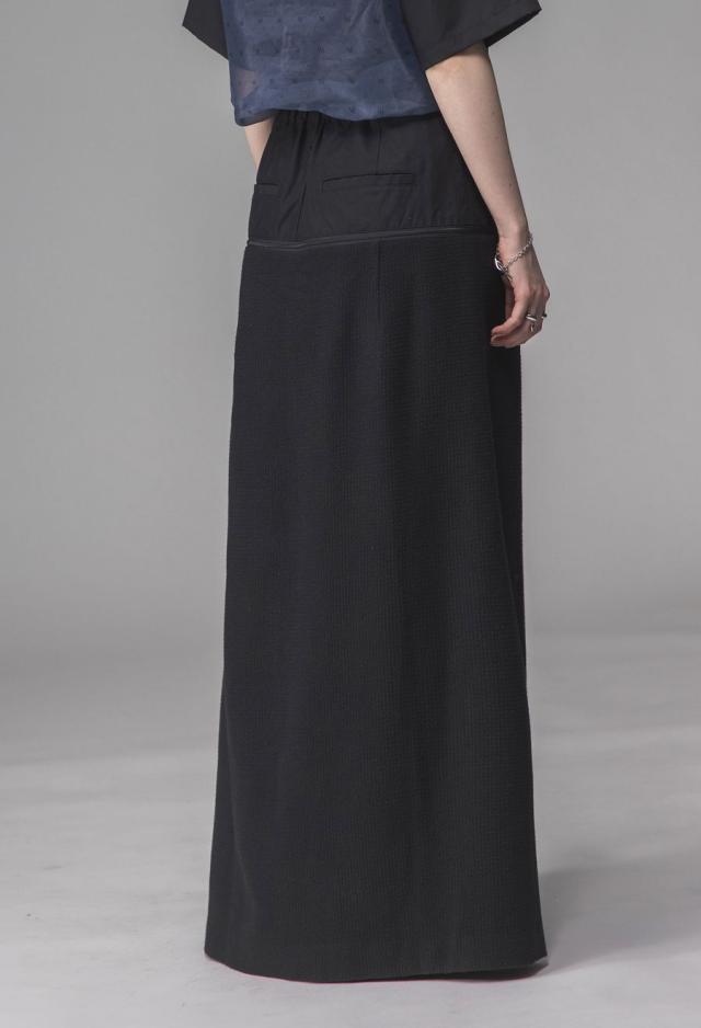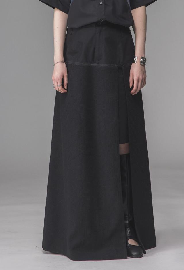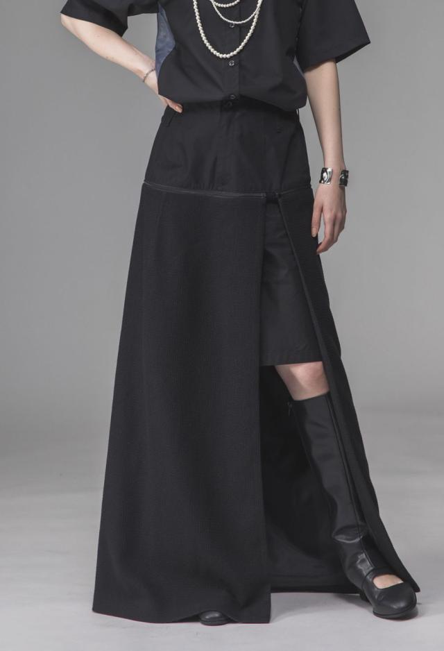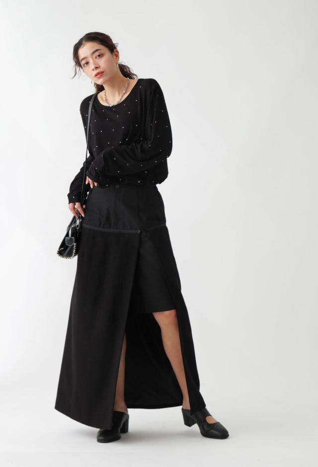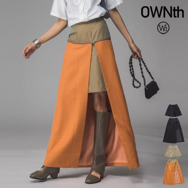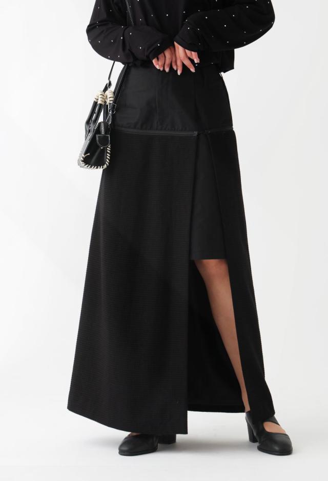 owt-0009 ロングスカート スカート ボトムス ハーフパンツ ショートパンツ パンツ付き 異素材切替 ラメ糸 裏地付き 肌見せ スリット ウエストゴム 美シルエット 取り外し可 無地