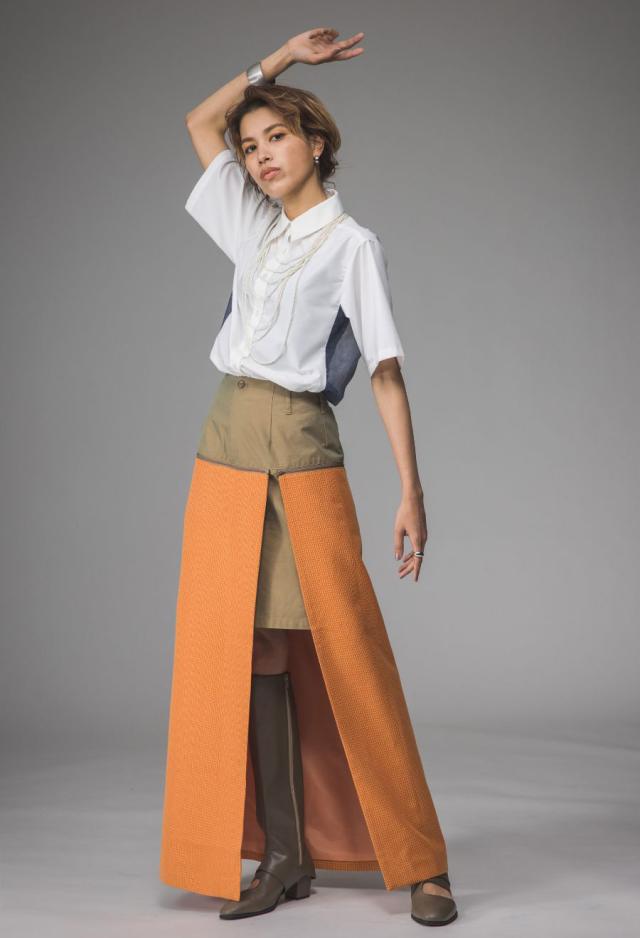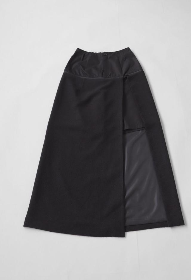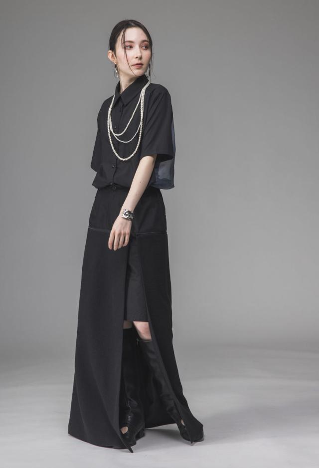 柄のような凹凸と光沢感を持つスカート生地は、片側スリット入りの肌見せデザインで抜け感を演出します。