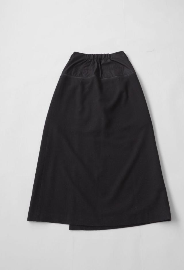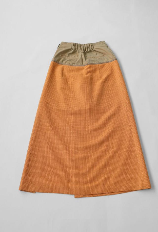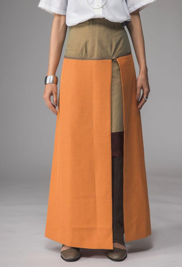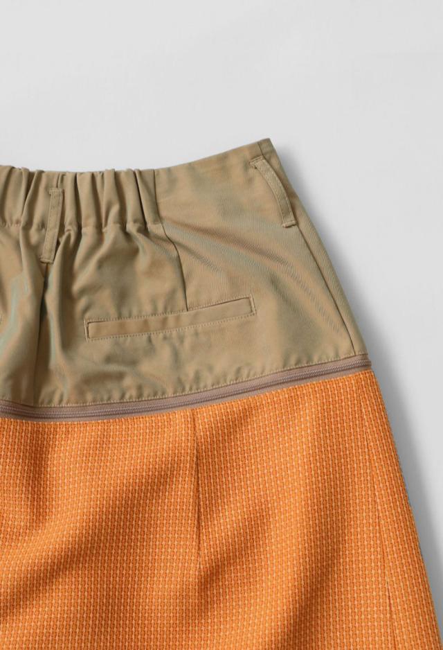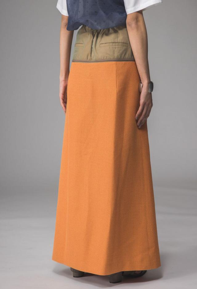 形状はAラインシルエットで、後ろウエストはゴム仕様。快適さと体型への柔軟性を兼ね備えています。