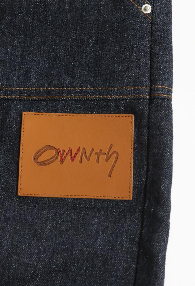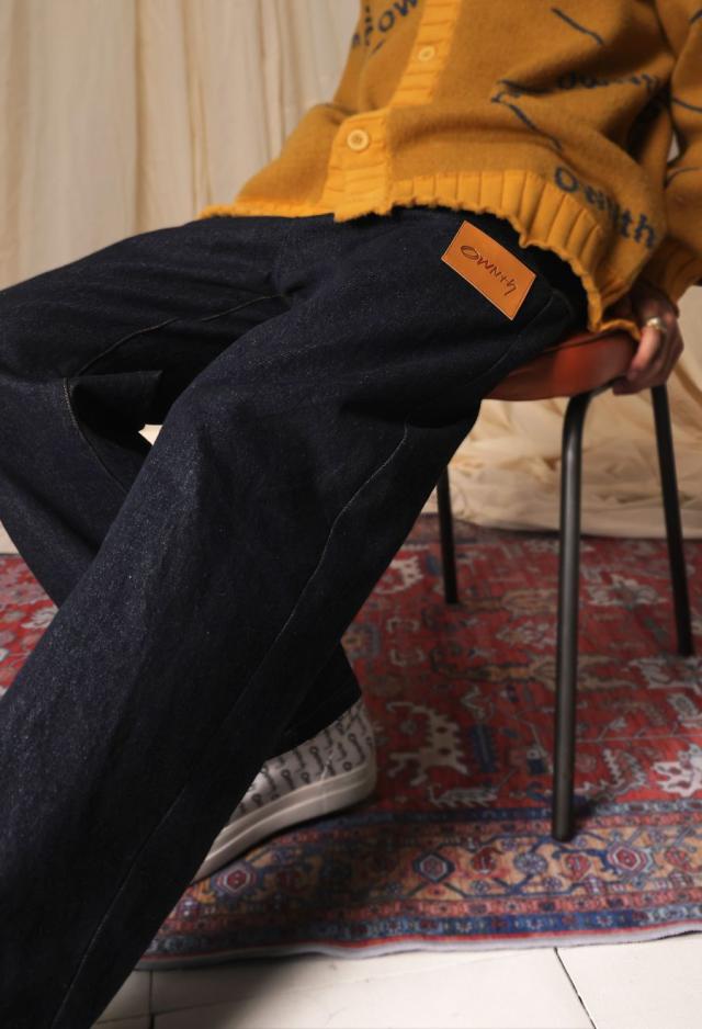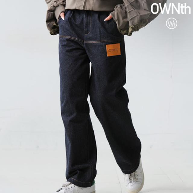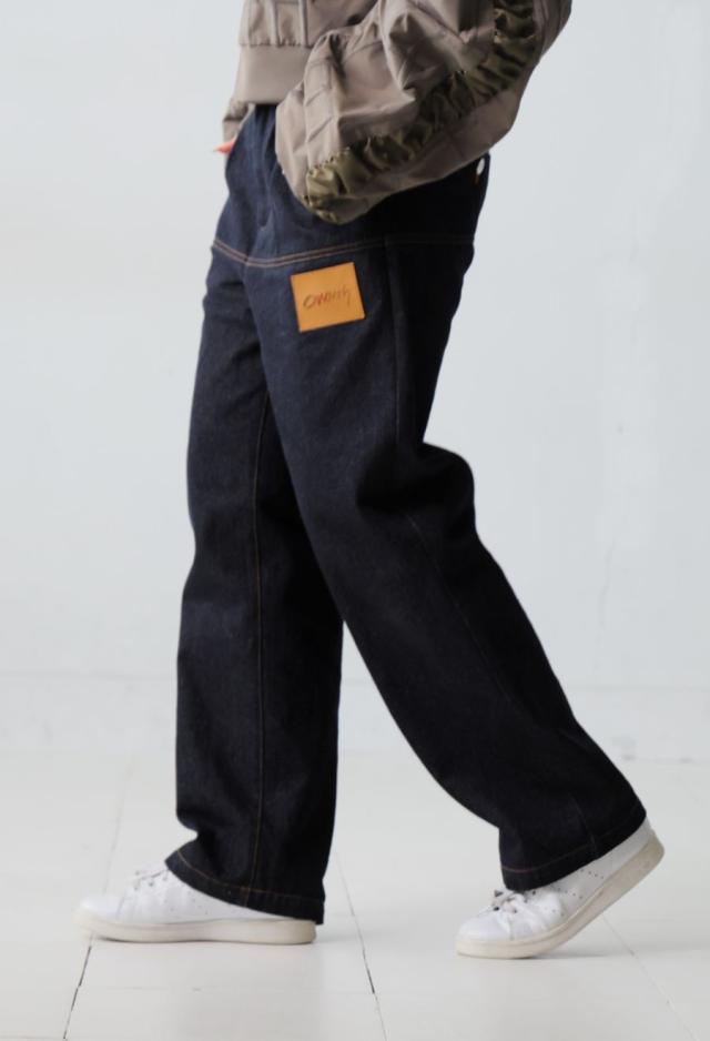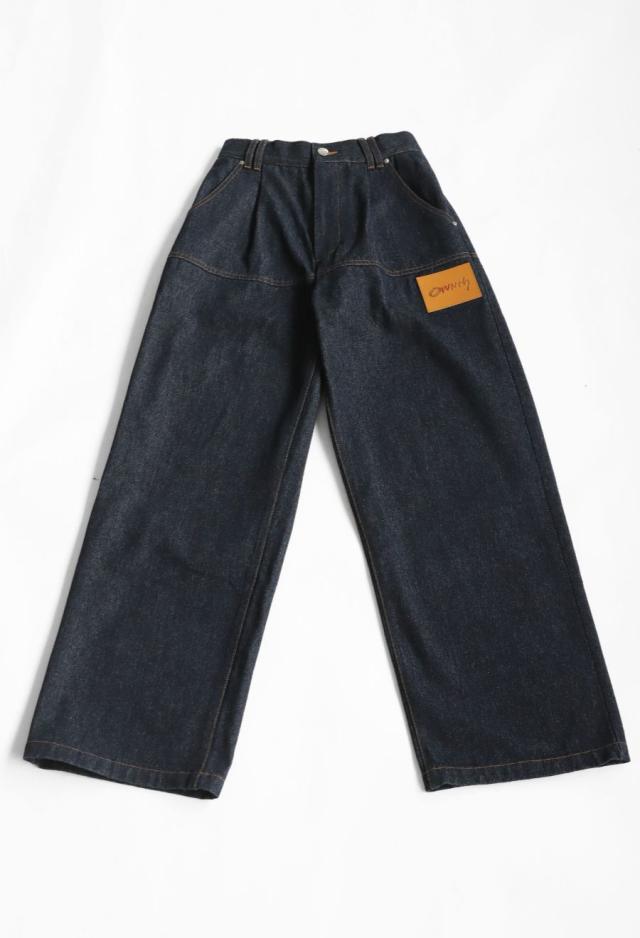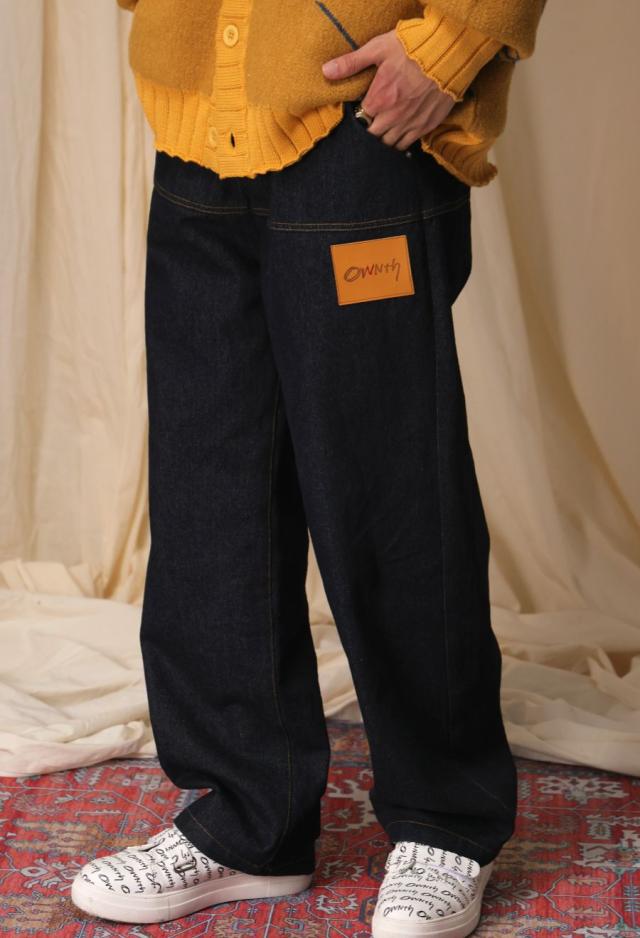owt-0093 ワイドデニム ジーンズ 体型カバー 濃紺 ストリート カジュアル リラックス 着回し 脚長効果 革パッチ ダブルステッチ 綿 綿100 ナチュラル 刻印 ポケット付き