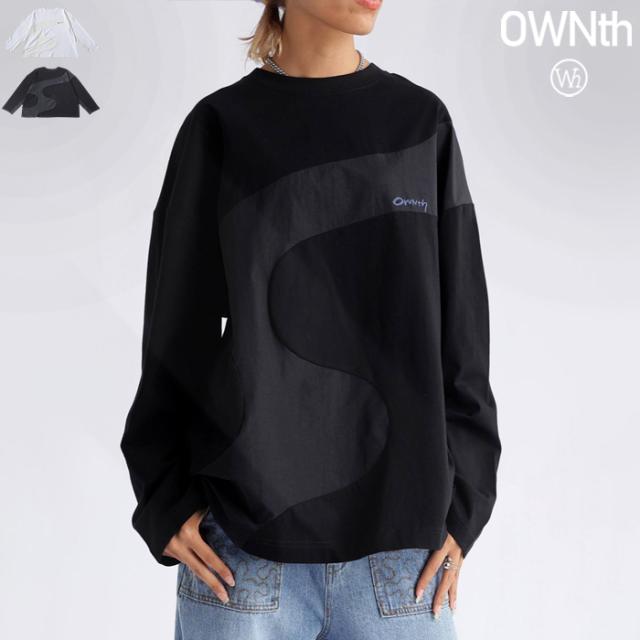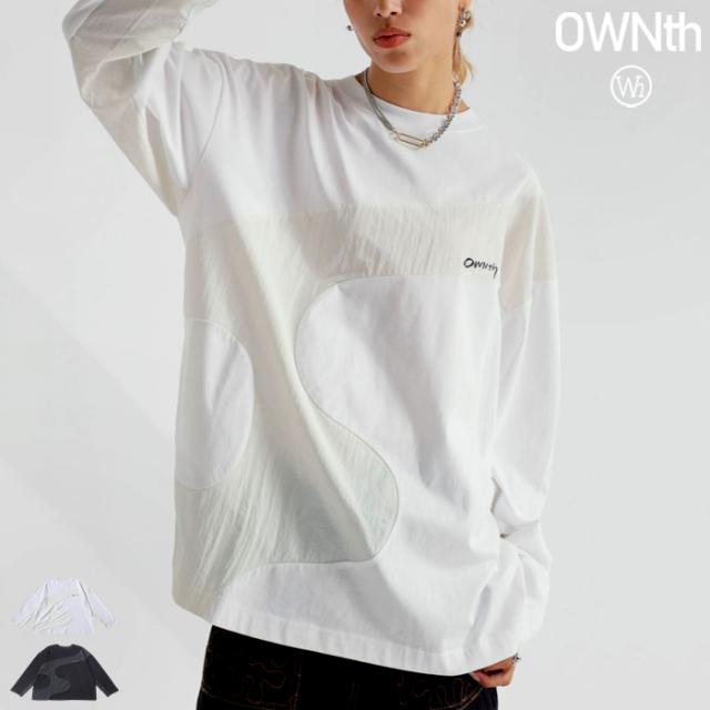 owt-0030 トップス カットソー ロンT Tシャツ メンズ レディース 長袖 クルーネック オーバーシルエット 異素材 ドッキング 綿 コットン ロゴ ロゴT 重ね着 レイヤード