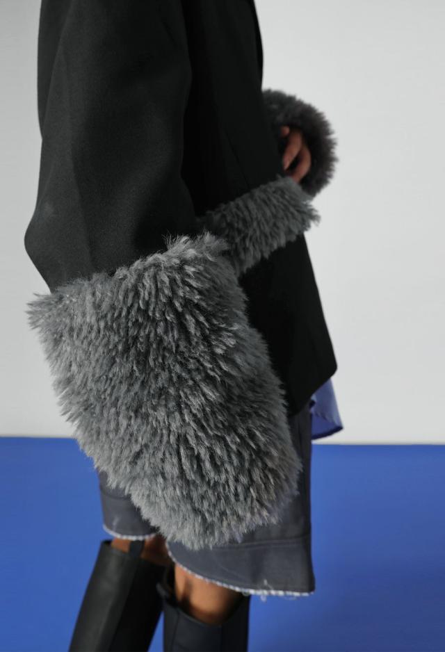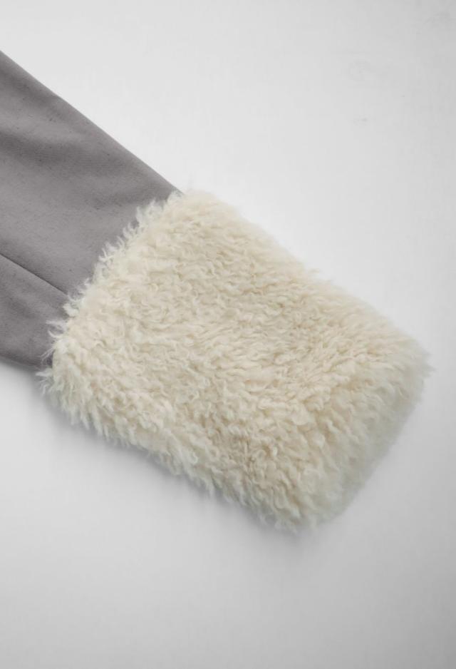袖口とポケット部分に毛足のあるファー素材を配し、冬らしいシーズンムードを引き立てます。
