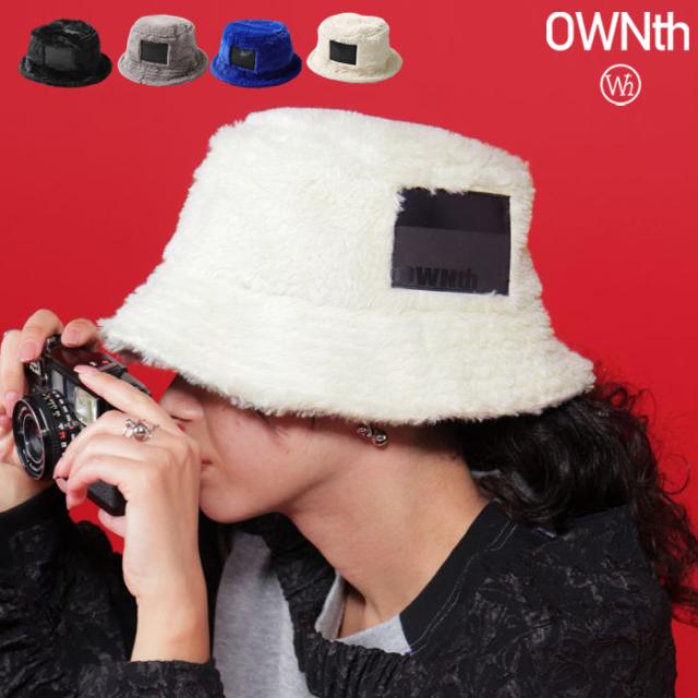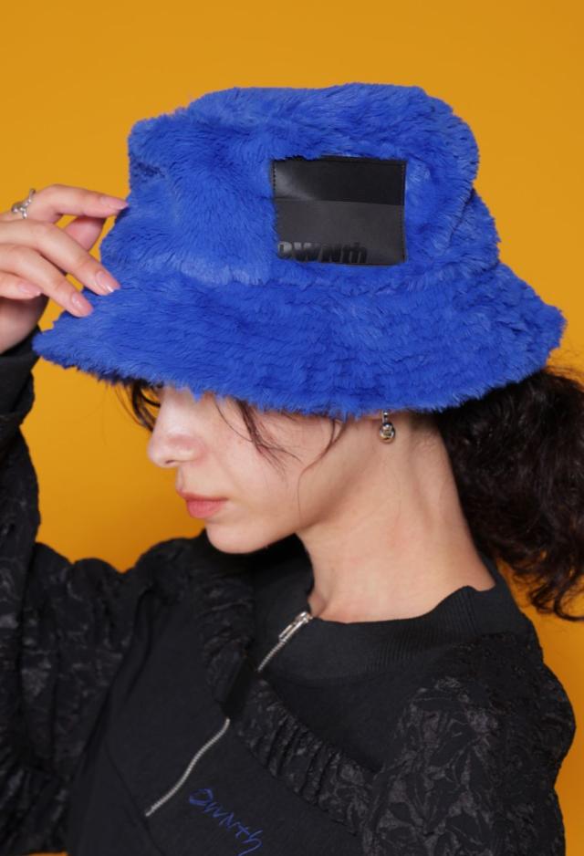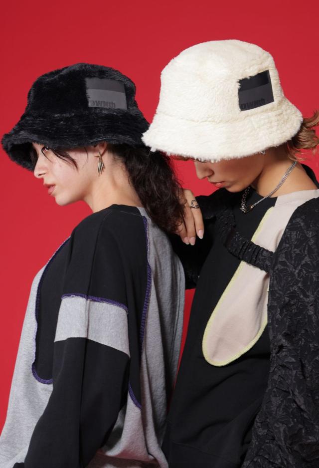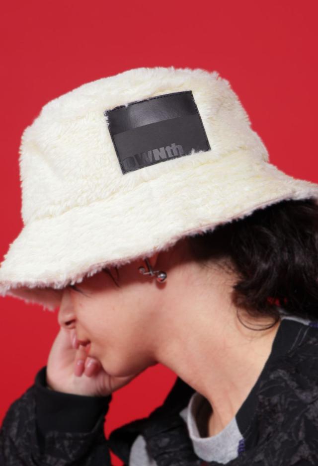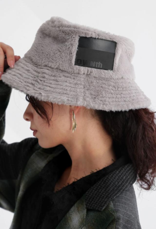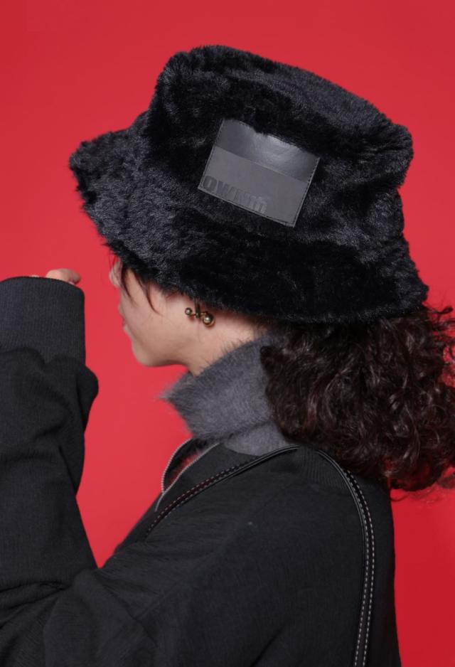 owt-0041 帽子 ハット バケットハット ファーハット フェイクファー ロゴ モコモコ ファー レザーパッチ 防寒 おしゃれ カジュアル ストリート プレゼント 無地 コーデ 小物
